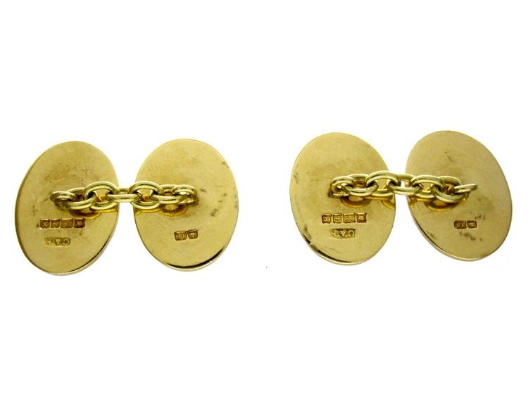 A good pair of 18ct75% pure gold (or 750 parts pure gold and 250 parts other metals) gold cufflinks by Crop and Farr. They are engraved on one side with a peacock motif.