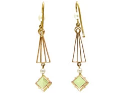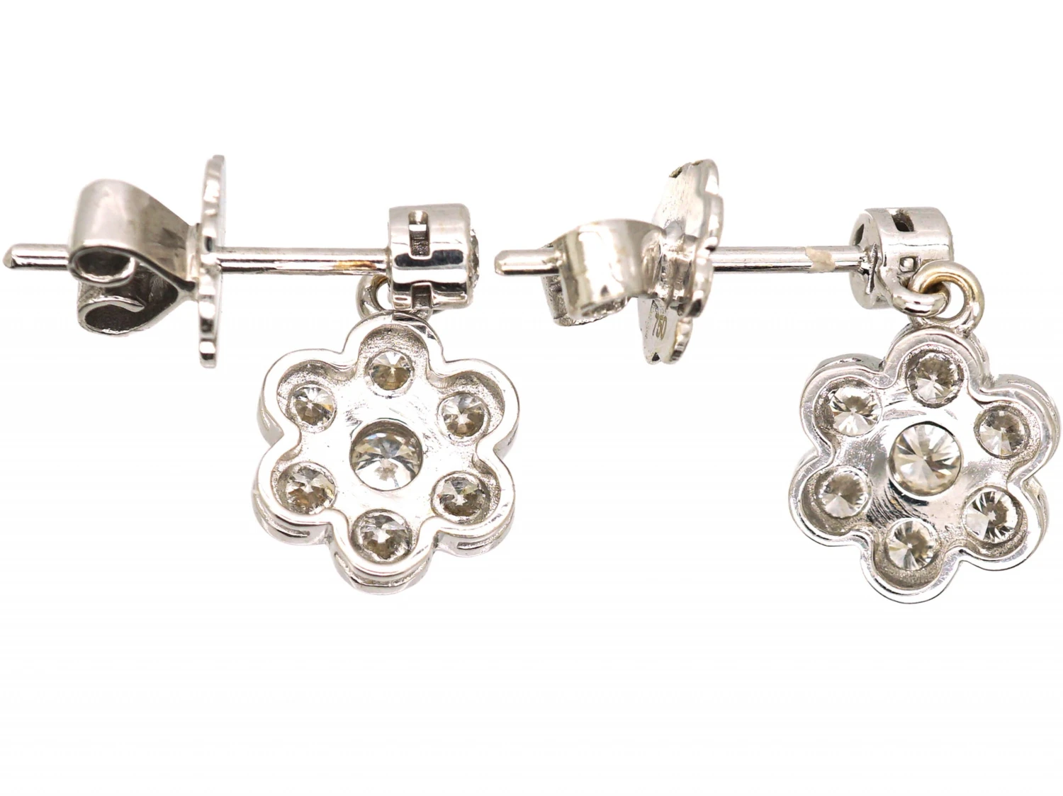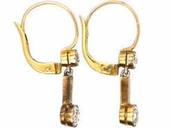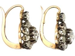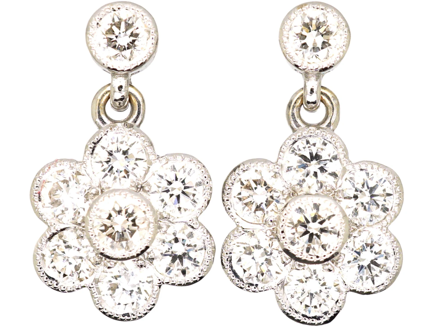 A useful pair of platinumDerives from the Spanish word ‘platina’ meaning ‘little silver’. Acknowledged since the 1900s, platinum’s durability and natural brightness has been and still is today highly treasured A metallic element prized for its rarity, whiteness, high tensile strength and insusceptibility to corrosion, platinum first became widely used in jewellery in the late ninete… and diamondA precious, lustrous gemstone made of highly compressed carbon. Diamonds are one of the hardest materials known to mankind. Colours of diamonds range from colourless, yellow, orange and brown to almost black. Natural coloured (or ‘fancy’) diamonds can be extremely rare. The cut, colour, clarity and carat weight of a diamond are the criteria jewellers use… drop earrings made in 1910 that are composed of two clusters each rub over and millgrain set with seven brilliant cutA circular gemstone cut, especially for diamonds or other transparent stones, with 57 or 58 facets. This cut returns the greatest amount of brilliancy, fire, and white light to the eye, making it an immensely popular cut. Also known as the Modern Brilliant Cut, the American Brilliant Cut, or the Ideal Cut. diamonds with a diamond above.
