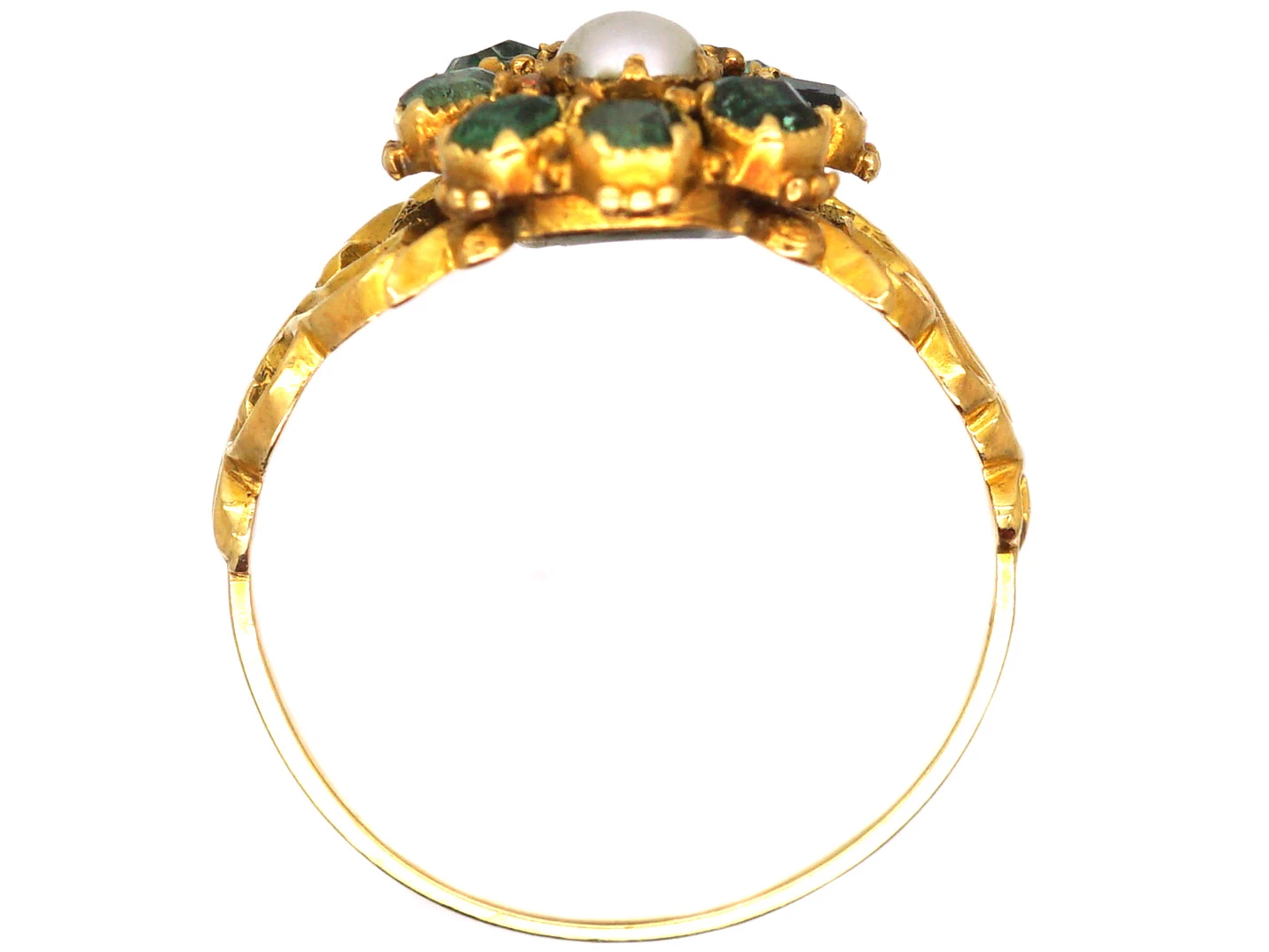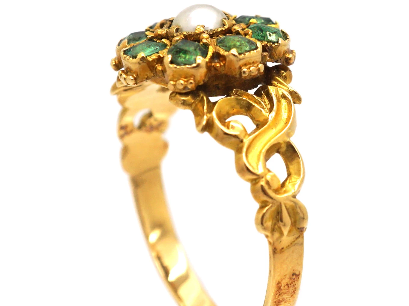A pretty 15ct62.5% pure gold (or 625 parts pure gold and 375 parts other metals). Popular during the Victorian, Edwardian and Art Deco eras but was discontinued in the mid-1930s. gold ring that was made circa 1830. In the centre is a clawA precious metal prong used to hold a gemstone in place. set naturalA natural stone is called such because it has not been subjected to any treatments. split pearlNatural pearls are an organic gem formed inside live mollusc shells and come in all shapes and sizes. They are formed as the result of a natural irritant within the mollusc’s mantle and as a defence, layers of iridescent nacre form over the top of it, creating a pearl. . Around it are eight pale emeralds in a flower design. The shouldersThe point on a ring where the central section meets the shank or band, often carved, decorated or inlaid with small diamond accent stones. are a lovely pierced scroll design. On the reverse is a small glazed locket that would originally have held a lock of hair.