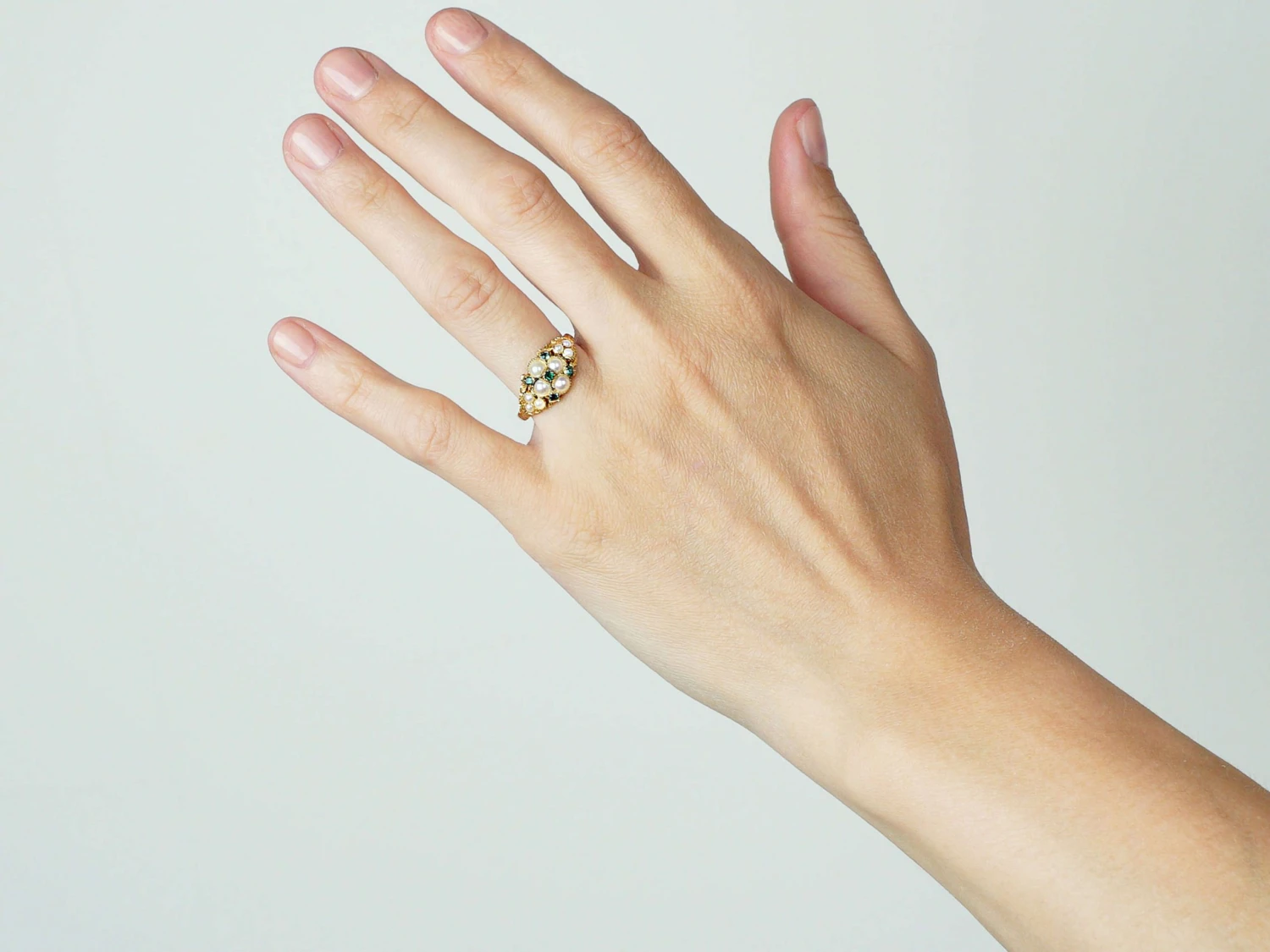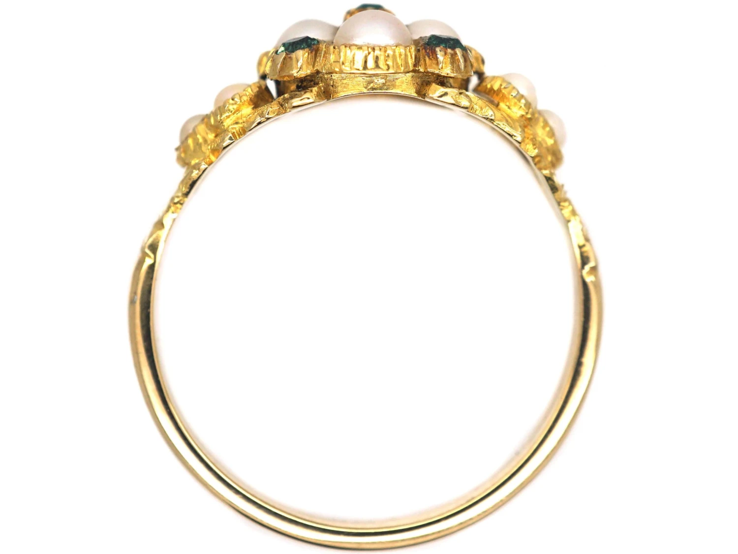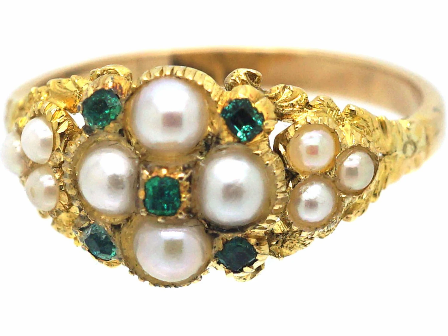 A stunning 15ct62.5% pure gold (or 625 parts pure gold and 375 parts other metals). Popular during the Victorian, Edwardian and Art Deco eras but was discontinued in the mid-1930s. gold ring that was made circa 1820-1830. It has been set with naturalA natural stone is called such because it has not been subjected to any treatments. split pearls in a lovely clusterA group of small diamonds or colourful gemstones grouped together to form a cluster, mimicking the look of a larger gem. Often this group can surround a larger center stone. design with three natural split pearls above an engraved foliate and flower design on either side. In the centre is a lovely small emeraldOne of the four ‘precious’ stones. An intense, deep green is the most desirable colour for emeralds. Flaws and cloudiness (‘jardin’) are very common in emeralds, so stones are often oiled, irradiated, and dyed to improve their look. Synthetic emeralds have fewer imperfections and are hard to set apart from natural stones. Emeralds belong to the beryl… with four more emeralds around the pearlNatural pearls are an organic gem formed inside live mollusc shells and come in all shapes and sizes. They are formed as the result of a natural irritant within the mollusc’s mantle and as a defence, layers of iridescent nacre form over the top of it, creating a pearl. cluster. These rings were so popular in the Regency period and one can imagine Jane Austin wearing it.