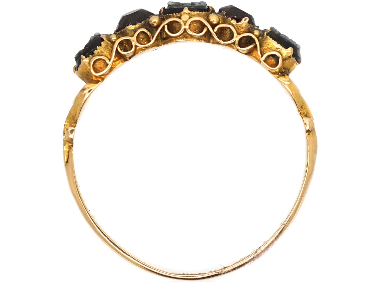 An unusual late Regency ring that was made circa 1830. It is 15ct62.5% pure gold (or 625 parts pure gold and 375 parts other metals). Popular during the Victorian, Edwardian and Art Deco eras but was discontinued in the mid-1930s. gold and has been set with three round carved banded onyxOnyx is an opaque black variety of polycrystalline chalcedony quartz. with flower detail. In between are two garnets that give contrast to the onyx in a Gothic way. The sides have lovely scroll detail that is typical of the period. The shouldersThe point on a ring where the central section meets the shank or band, often carved, decorated or inlaid with small diamond accent stones. have a sweet motif that give the ring a light look. It would make a pretty dress ring