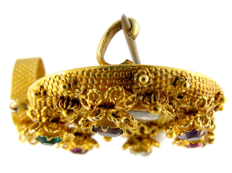 This Regard locket and brooch is in excellent condition. The gold filigreeA means of decoration, achieved by soldering very fine gold or silver wires into intricate patterns. Historically, filigree was created by applying the wires to an underlying base. As the craft evolved, the base was abandoned and the result was a lighter, airier, lacy, openwork jewelry item. The latter style was especially popular during the nineteenth centu… work is in mint condition. The gemstones around the locket section spell ‘Regard’ – RubyOne of the most valuable gemstones on earth. From the corundum family, the red variety being ruby and the blue, sapphire. With the exception of the diamond, corundum is the hardest of the gemstones on the Mohs scale scoring a 9., EmeraldOne of the four ‘precious’ stones. An intense, deep green is the most desirable colour for emeralds. Flaws and cloudiness (‘jardin’) are very common in emeralds, so stones are often oiled, irradiated, and dyed to improve their look. Synthetic emeralds have fewer imperfections and are hard to set apart from natural stones. Emeralds belong to the beryl…, GarnetDescribes a group of several closely related minerals. Garnets come in a variety of colours, however the most common colour is dark red. In descriptions, ‘garnet’ tends to refer to dark red stones unless otherwise specified., AmethystAmethyst is the purple variety of macrocrystalline quartz. From the Greek amethystos meaning ‘a remedy against drunkedness’, it was believed to prevent intoxication and ensure the wearer retains a clear head and quick wit. It was once considered as valuable as ruby, sapphire and emerald., Ruby and DiamondA precious, lustrous gemstone made of highly compressed carbon. Diamonds are one of the hardest materials known to mankind. Colours of diamonds range from colourless, yellow, orange and brown to almost black. Natural coloured (or ‘fancy’) diamonds can be extremely rare. The cut, colour, clarity and carat weight of a diamond are the criteria jewellers use…. The Georgians loved secret meanings in jewellery. This would have been given as a token of regard. It has a small hinged locket in the centre which may originally have contained a lock of hair. As a collector’s piece I would recommend it as these items in good original condition are rare.