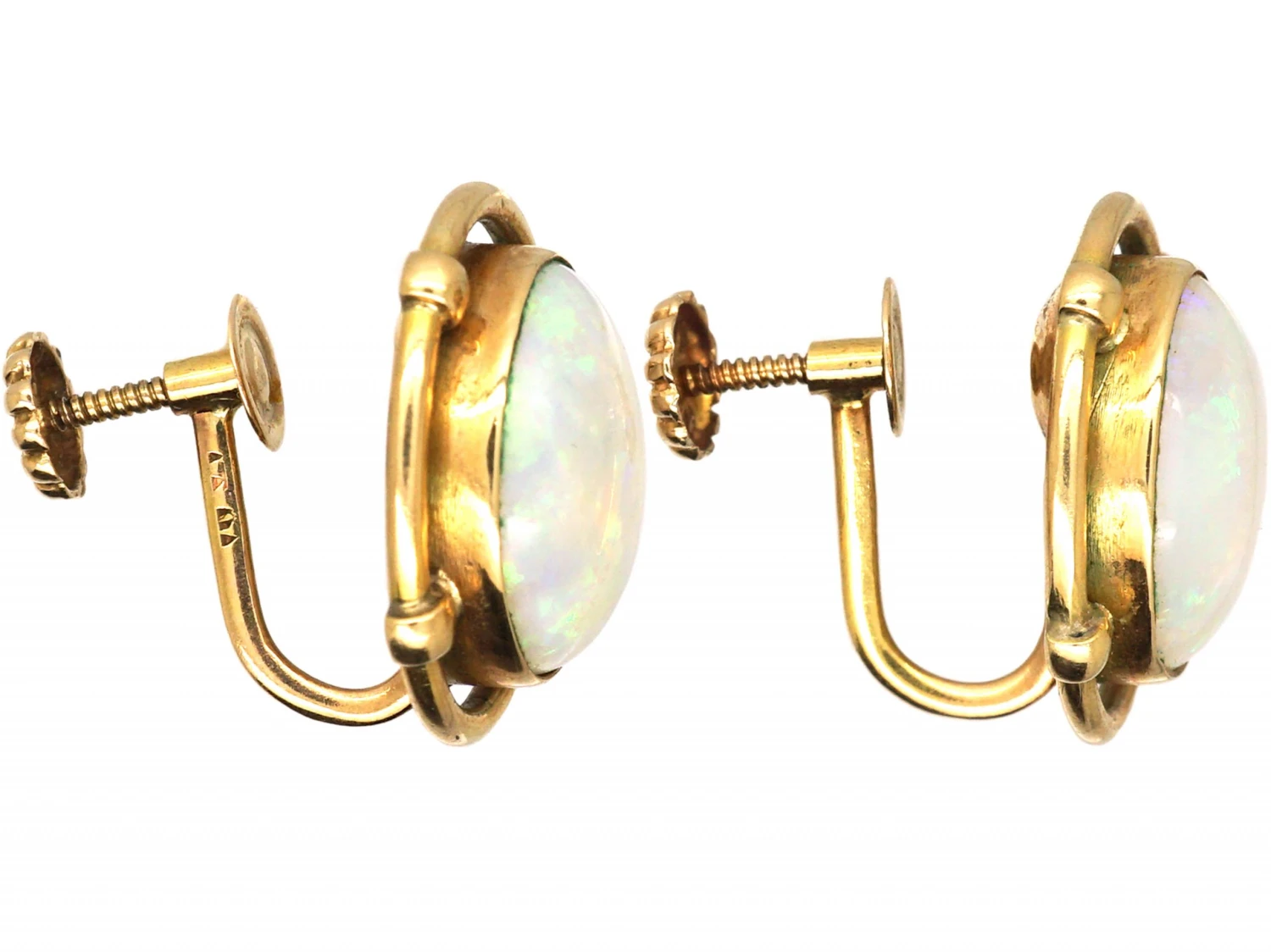 cut opalOpals occur in a range of body colours from white, black or grey, bright orangey red and a pale watery colour. The most precious opals show strong colour contrast and generally have a dark body colour with a vivid array of colour play.. The opals are a good match and weigh approximately 2.88 caratsThe unit of weight for a diamond or other gemstone and also for a pearl. Abbreviated ‘ct’, 1 carat is equal to 0.2 grams. In reference to gold, a unit of purity or fineness of gold and gold alloy, expressed as a number out of 24 parts by weight, e.g. ’24 carat’ signifies pure gold, ’18 carat’ 18/24th gold in the alloy, et cetera. Also abbreviated as ‘c… each. At present they have screw on fittings but these can be changed to post and scroll fittings if wanted.