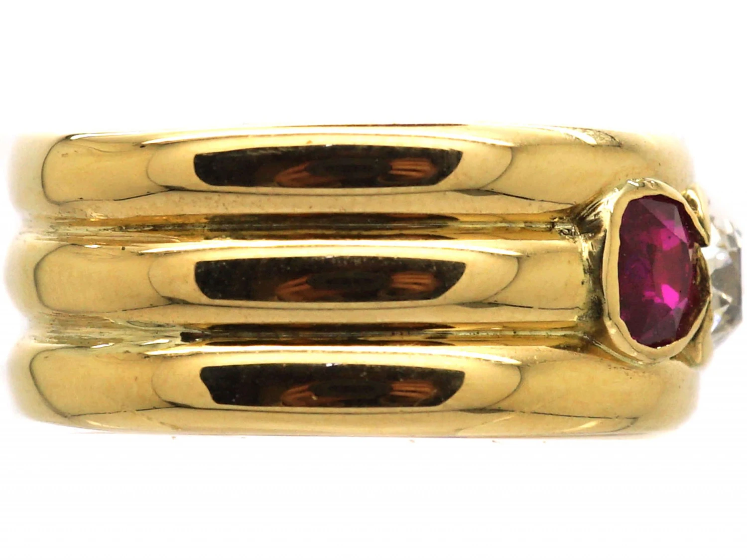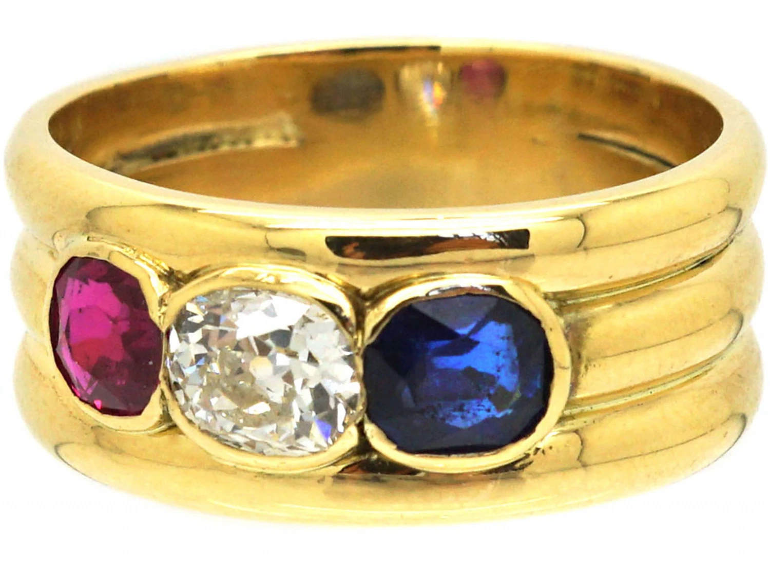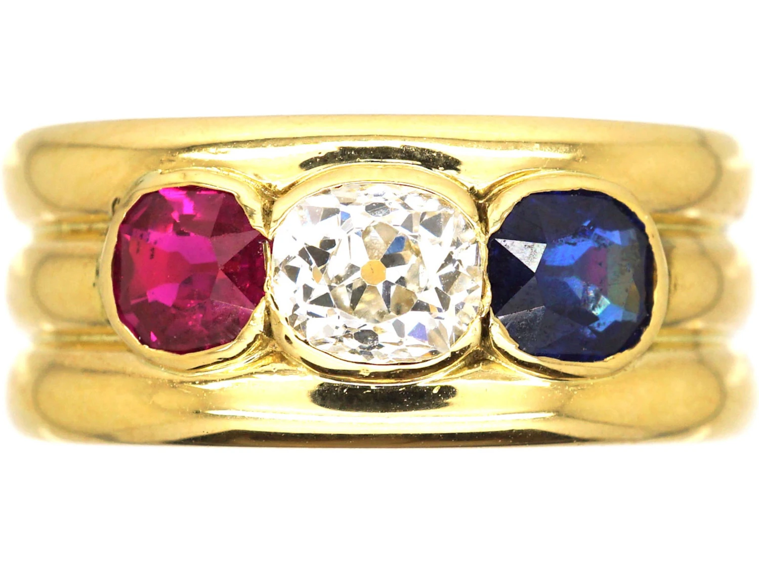 on one side and a rubyOne of the most valuable gemstones on earth. From the corundum family, the red variety being ruby and the blue, sapphire. With the exception of the diamond, corundum is the hardest of the gemstones on the Mohs scale scoring a 9. on the other. They are set slightly above three conjoined bands. It is hard to date it as it could have been an English patriotic ring made in the late 1940s. Either way it is a lovely ring and very comfortable to wear.