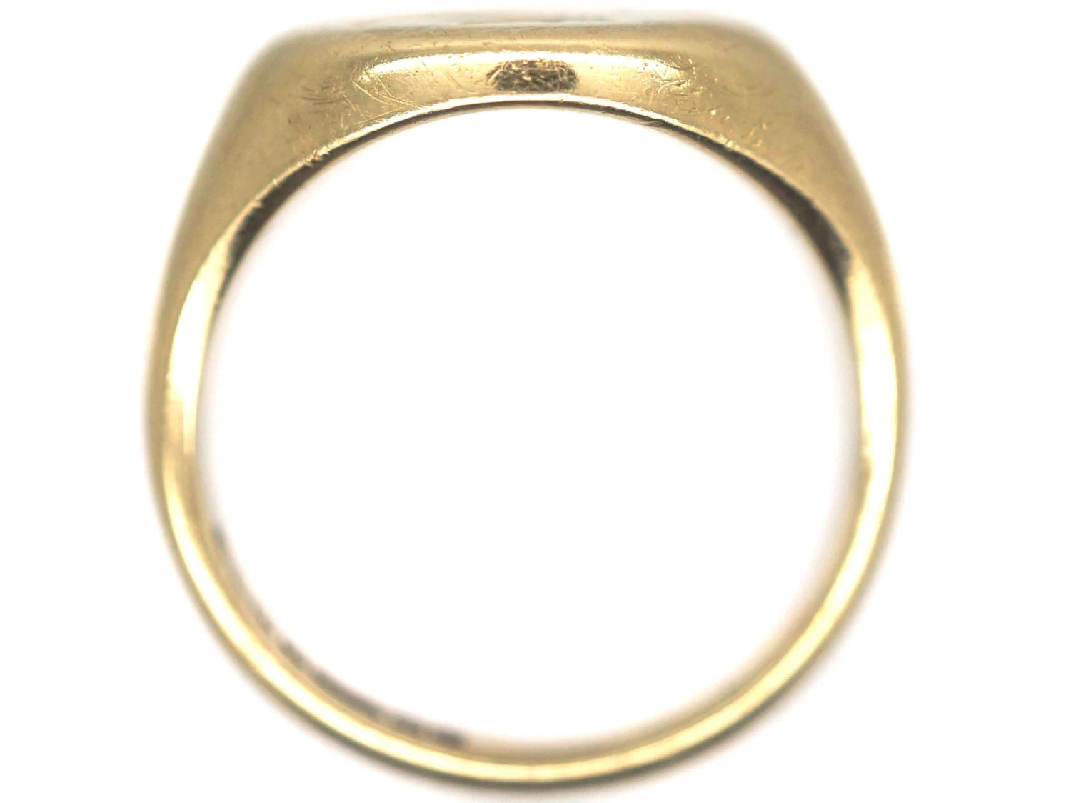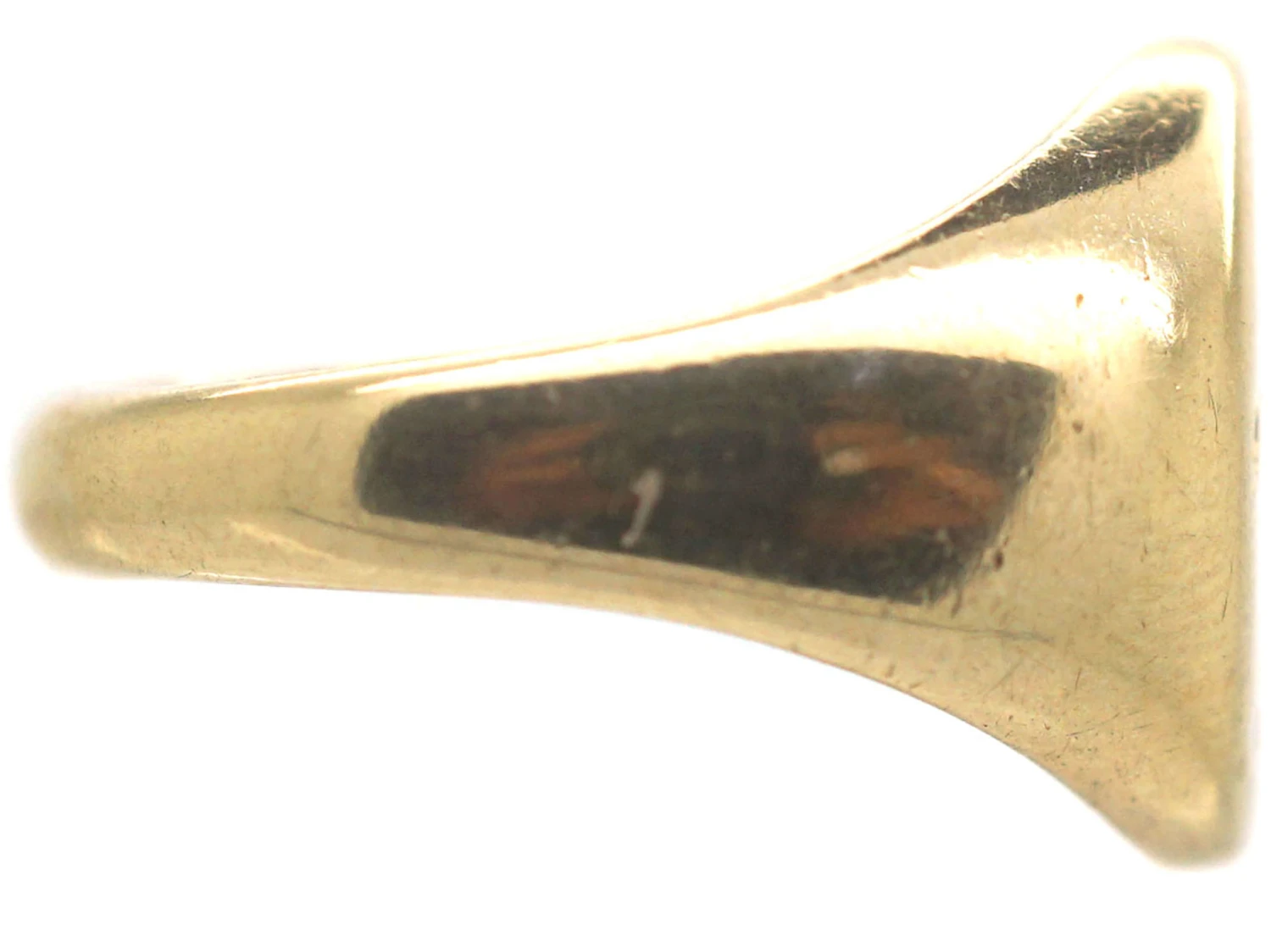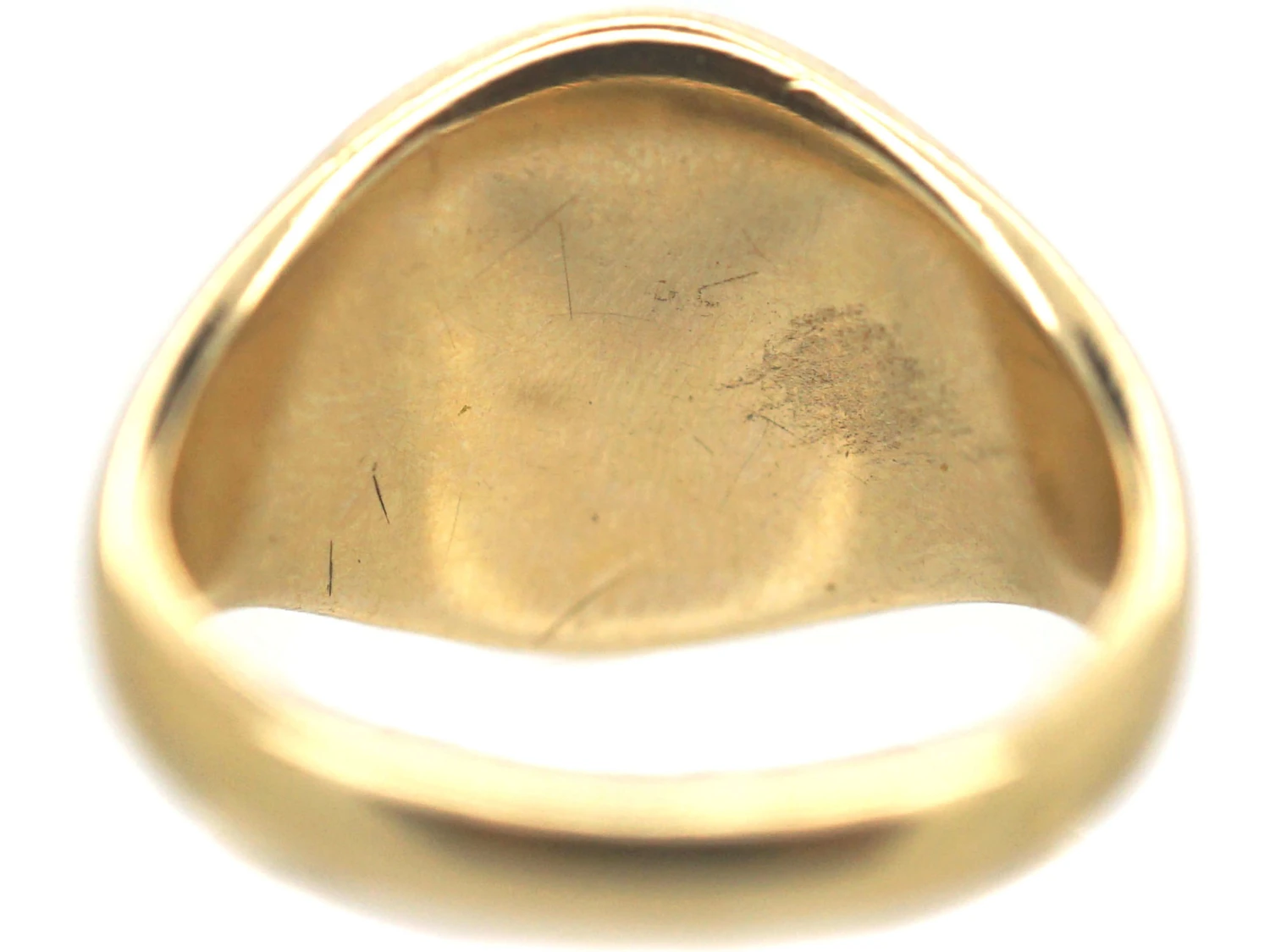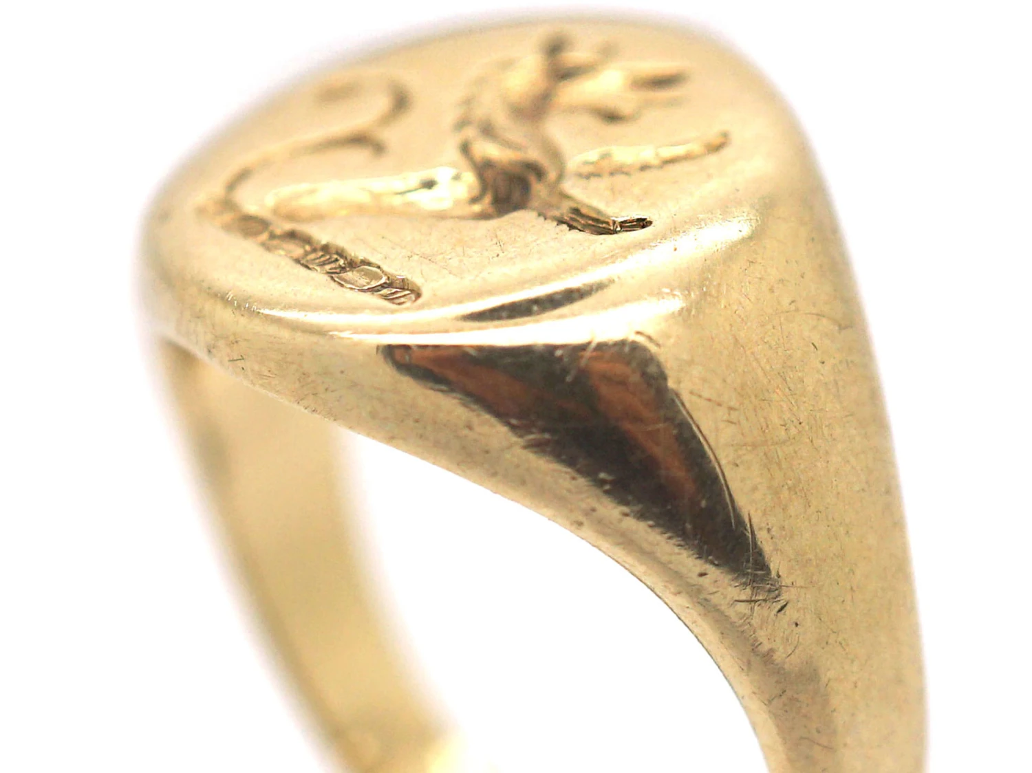 A good 9ct37.5% pure gold (or 375 parts pure gold and 625 parts other metals) gold signet ringA ring with a central plaque on which one’s initials, a seal, or a crest is engraved. that was made in 1945. The top has been engraved with a rampant heraldic wolf. This ring would be ideal for the wolf in your life!