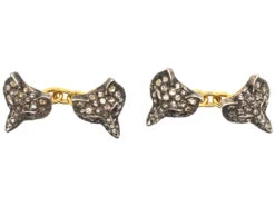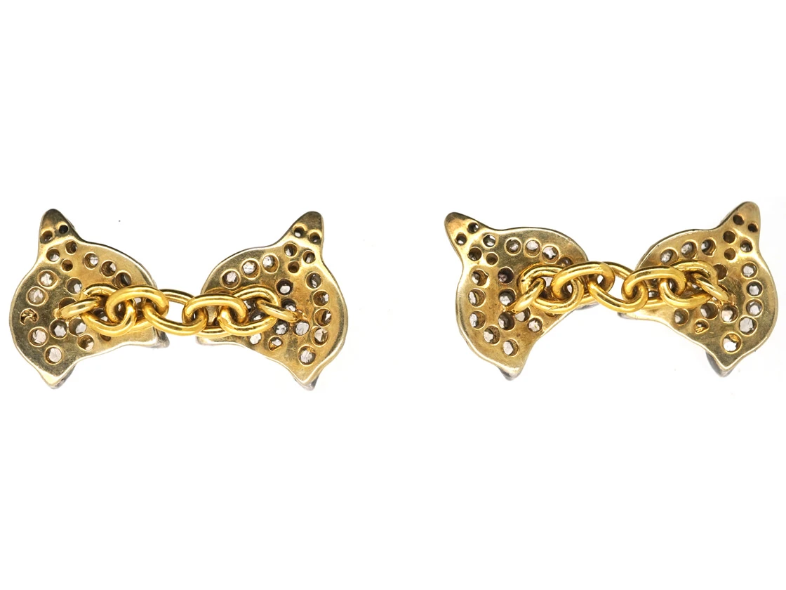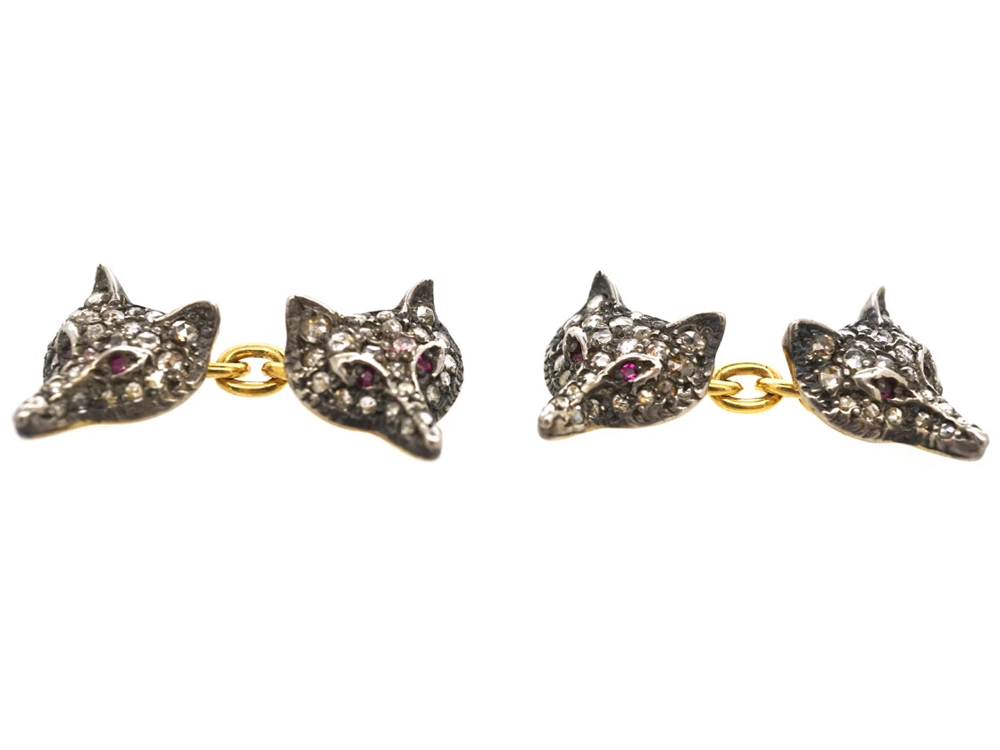 These cufflinks are really striking. The diamondA precious, lustrous gemstone made of highly compressed carbon. Diamonds are one of the hardest materials known to mankind. Colours of diamonds range from colourless, yellow, orange and brown to almost black. Natural coloured (or ‘fancy’) diamonds can be extremely rare. The cut, colour, clarity and carat weight of a diamond are the criteria jewellers use… set foxes heads with small rubyOne of the most valuable gemstones on earth. From the corundum family, the red variety being ruby and the blue, sapphire. With the exception of the diamond, corundum is the hardest of the gemstones on the Mohs scale scoring a 9. eyes are well modelled and are gold and silverA metallic element which is malleable and ductile, and white in colour, making it ideal for use in jewellery. It is usually mixed with copper to improve its hardness.