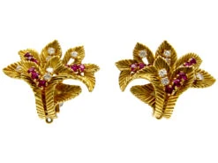 A pair of yellow gold RubyOne of the most valuable gemstones on earth. From the corundum family, the red variety being ruby and the blue, sapphire. With the exception of the diamond, corundum is the hardest of the gemstones on the Mohs scale scoring a 9. and DiamondA precious, lustrous gemstone made of highly compressed carbon. Diamonds are one of the hardest materials known to mankind. Colours of diamonds range from colourless, yellow, orange and brown to almost black. Natural coloured (or ‘fancy’) diamonds can be extremely rare. The cut, colour, clarity and carat weight of a diamond are the criteria jewellers use… earclips of foliate design made around 1870-1980. The engraved detail gives these earrings a strong vintageRefers to jewellery of at least 50 but no more than 100 years of age. look.