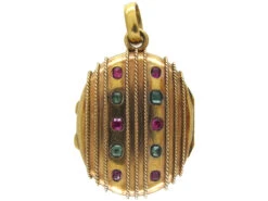 A lovely oval 15 ct gold locket which has two rows of alternate emeralds and rubies with rope beading in between. It is in great condition and rather special.
