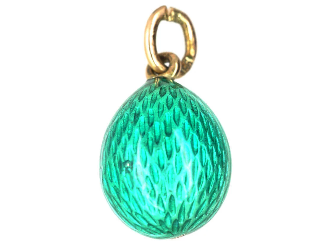 An unusual 14ct58.5% pure gold (or 585 parts pure gold to 415 parts other metals) gold Russian egg pendant or charm that was made circa 1900-1910. It has been enamelled in a turquoiseTurquoise is an opaque gem and is often formed in what is called matrix, a black or brown veining derived from the host rock in which the gem forms. In fine jewellery, unblemished sky blue turquoise is the ideal, although regularly patterned matrix turquoise is also sought-after. colour with a three leaf clover set with two diamonds and a peridotA variety of chrysolite. It is the gem of variety of olivine. The colour is generally a warm olive or yellowish green.