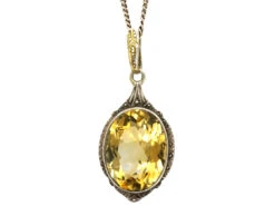 pendant that was made in Germany circa 1920. It is set with a good mid yellow citrineCitrine (from the French for ‘lemon’) is a rare, yellow type of quartz, a semi-precious stone that ranges in colour from pale yellow to orange to golden brown. The best quality citrine is found in Brazil.. It comes with quite a long silver chain.