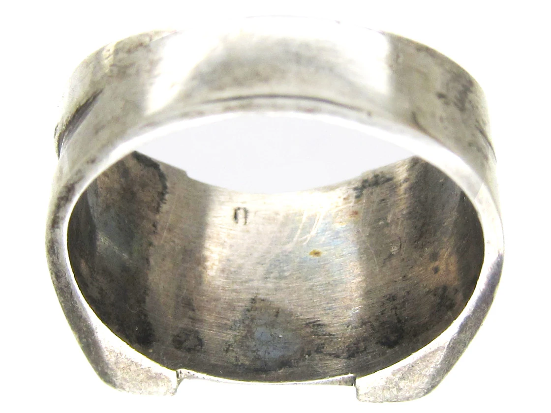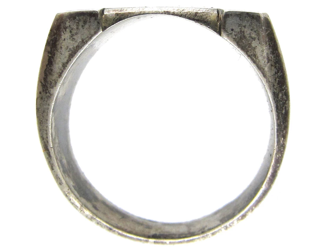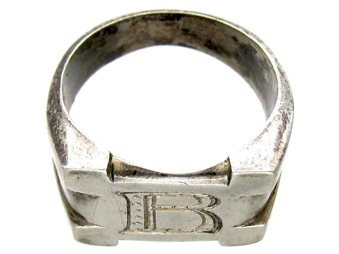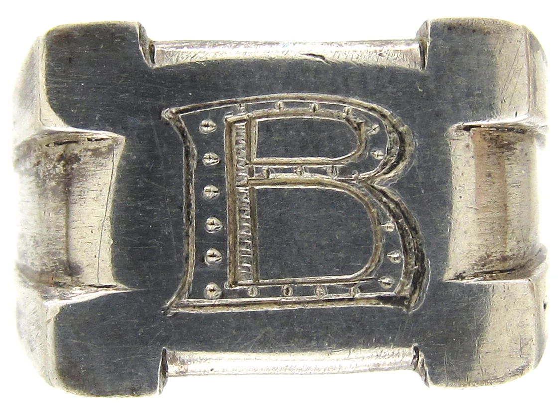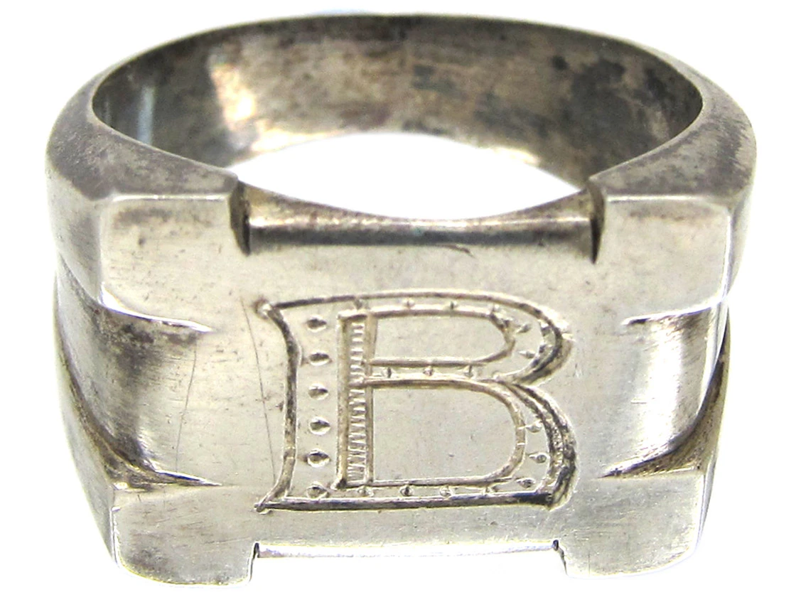 A fun RetroJewellery made in the Retro era (1940s). ring, circa 1940, with the letter “B” engraved in the silverA metallic element which is malleable and ductile, and white in colour, making it ideal for use in jewellery. It is usually mixed with copper to improve its hardness.