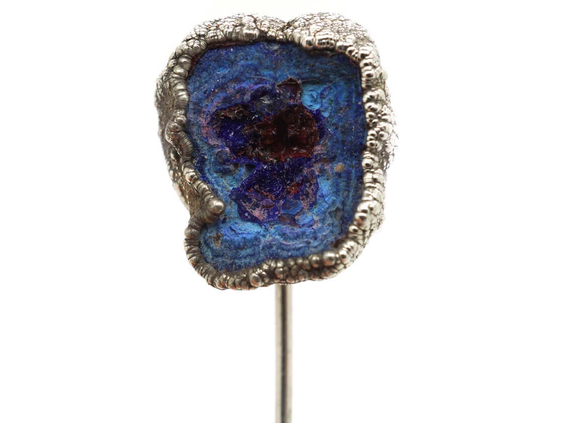 Someone obviously thought this little geode of agateA variety of cryptocrystalline quartz (chalcedony), typically banded in appearance. The use of agate in jewellery dates back to the Stone Age. was rather special and has made it into a tie pin. Inside the geode is an element of red agate as well. The silverA metallic element which is malleable and ductile, and white in colour, making it ideal for use in jewellery. It is usually mixed with copper to improve its hardness.