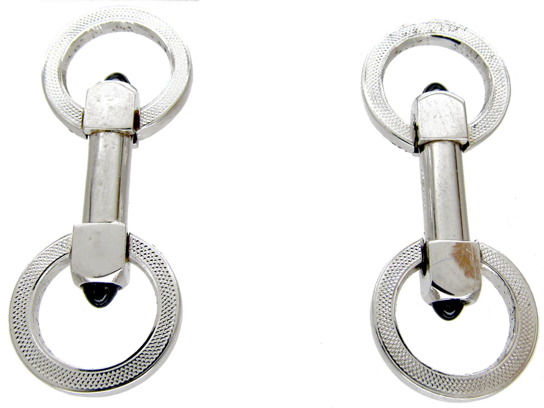 cufflinks which have pointed facetedA faceted stone has small, flat-cut surfaces that make a sparkling effect on transparent stones. Facets act as both mirrors and windows. Reflecting light and channelling light into a stone where it refracts and re-emerges. onyxOnyx is an opaque black variety of polycrystalline chalcedony quartz. ends. The reverse side has a different pattern on it. They hinge down in order to go through the shirt.
