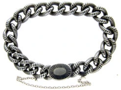 A well designed nielloA black alloy of copper, silver and lead sulphides, used as a decorative inlay. bracelet which can be worn on both sides. One side has gold on the top of the links, the other is niello only. Niello is a black mixture of copper, silverA metallic element which is malleable and ductile, and white in colour, making it ideal for use in jewellery. It is usually mixed with copper to improve its hardness.
