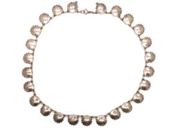 This necklace was made by the Danish designer Hermann Siersbol who opened his workshop in April 1945. He had a mission to make affordable quality jewellery in modern Scandinavian designs. He started with an investment of 2000 crowns which he had laid aside of his salary as a silversmith apprentice. His company has slowly become one of the largest silverA metallic element which is malleable and ductile, and white in colour, making it ideal for use in jewellery. It is usually mixed with copper to improve its hardness.