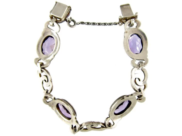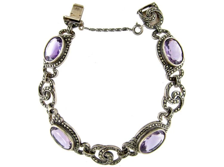 and marcasiteThe marcasite of jewellery is in fact iron pyrite as marcasite itself is too brittle alone for the durability required of a piece. This jewellery marcasite is sometimes called ‘fool’s gold’ given its heavily metallic appearance. Marcasite of this kind also offers a kind of iridescence, explaining its use as a more affordable diamond replacement that wi… bracelet which has also been set with amethysts. The colour combination is lovely with the greyish effect of the silver and marcasite against the purple of the amethysts. It was made circa 1925.