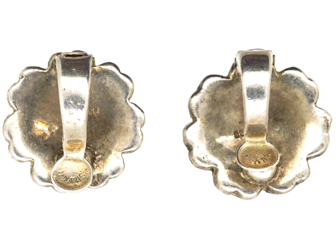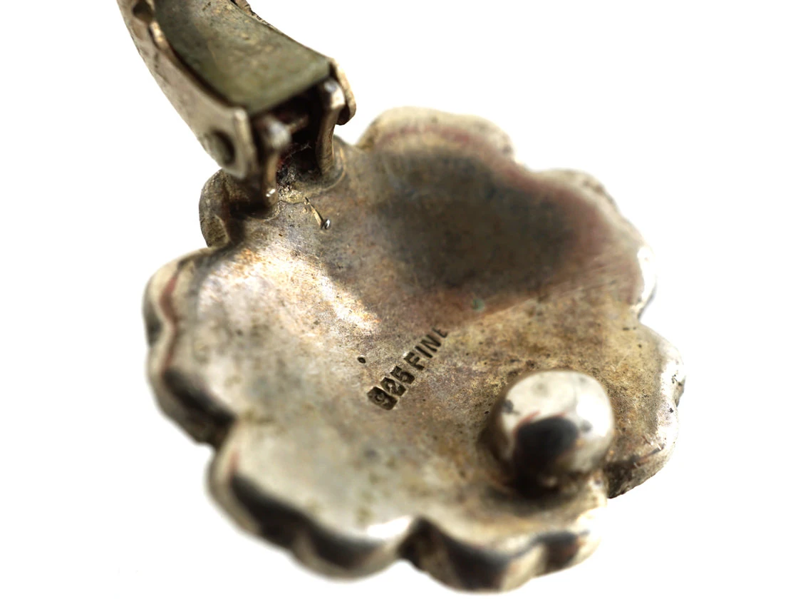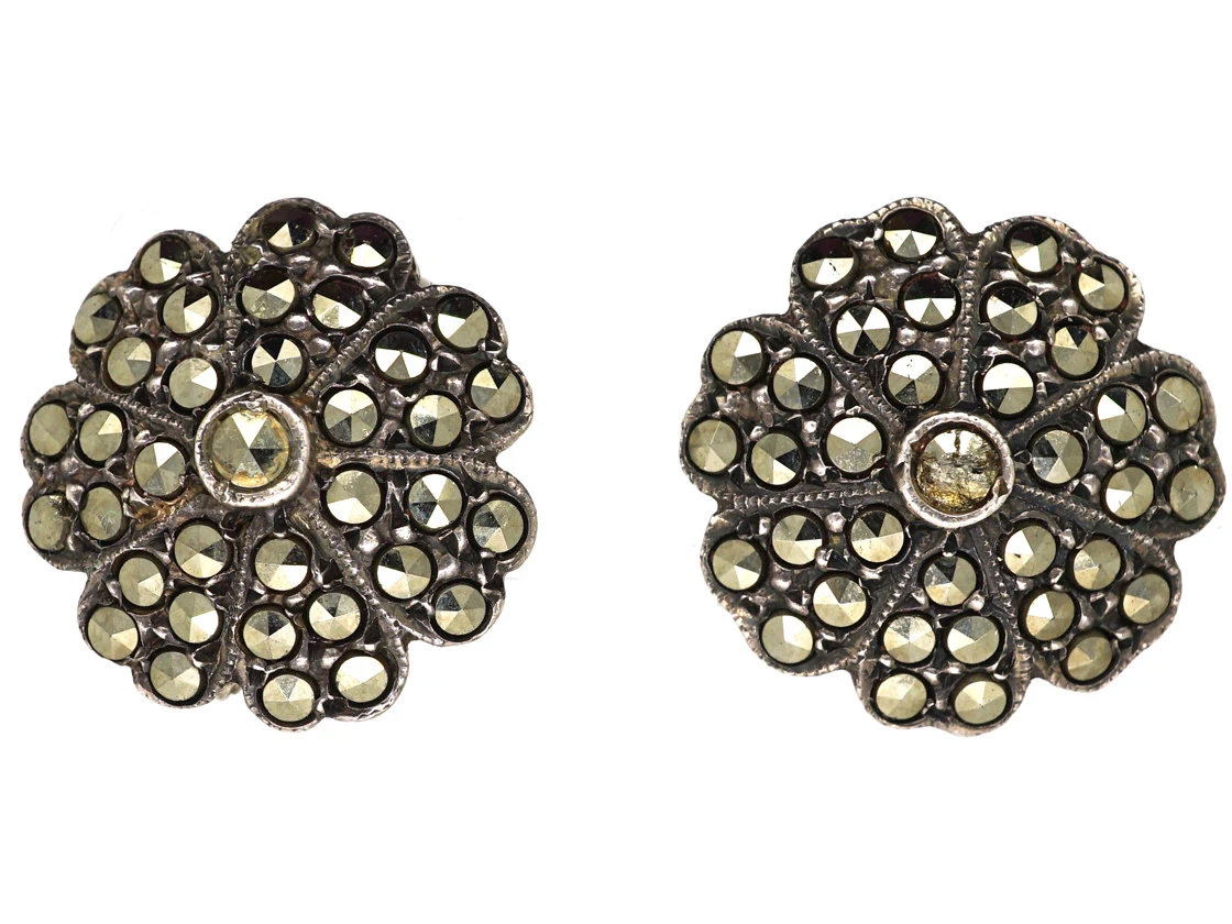 flower earrings that have been set with graded marcasiteThe marcasite of jewellery is in fact iron pyrite as marcasite itself is too brittle alone for the durability required of a piece. This jewellery marcasite is sometimes called ‘fool’s gold’ given its heavily metallic appearance. Marcasite of this kind also offers a kind of iridescence, explaining its use as a more affordable diamond replacement that wi… (iron pyrites) They have clip-on fittings and were made in the 1930s when this style was popular. The marcasite glitters like rose diamonds at night.