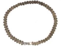 necklace set with graded marcasiteThe marcasite of jewellery is in fact iron pyrite as marcasite itself is too brittle alone for the durability required of a piece. This jewellery marcasite is sometimes called ‘fool’s gold’ given its heavily metallic appearance. Marcasite of this kind also offers a kind of iridescence, explaining its use as a more affordable diamond replacement that wi… (iron pyrites) It is designed with articulatedIn jewellery, an articulated piece is composed of segments with flexible connections. double leaves which curve around the neck. It was made in the 1950s and has a bracelet to match in the “bracelets” section.