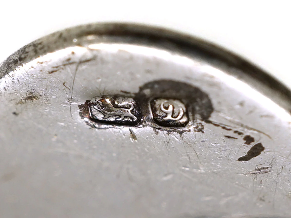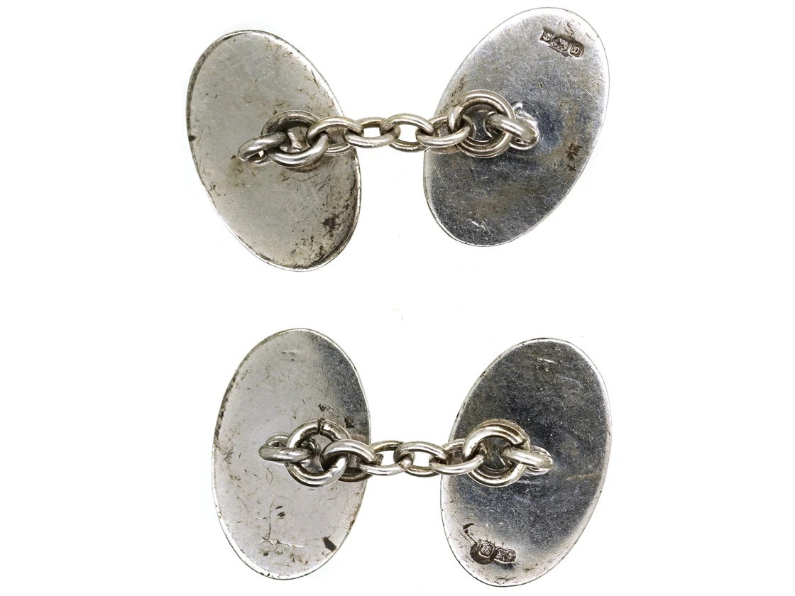 A pair of oval silverA metallic element which is malleable and ductile, and white in colour, making it ideal for use in jewellery. It is usually mixed with copper to improve its hardness.