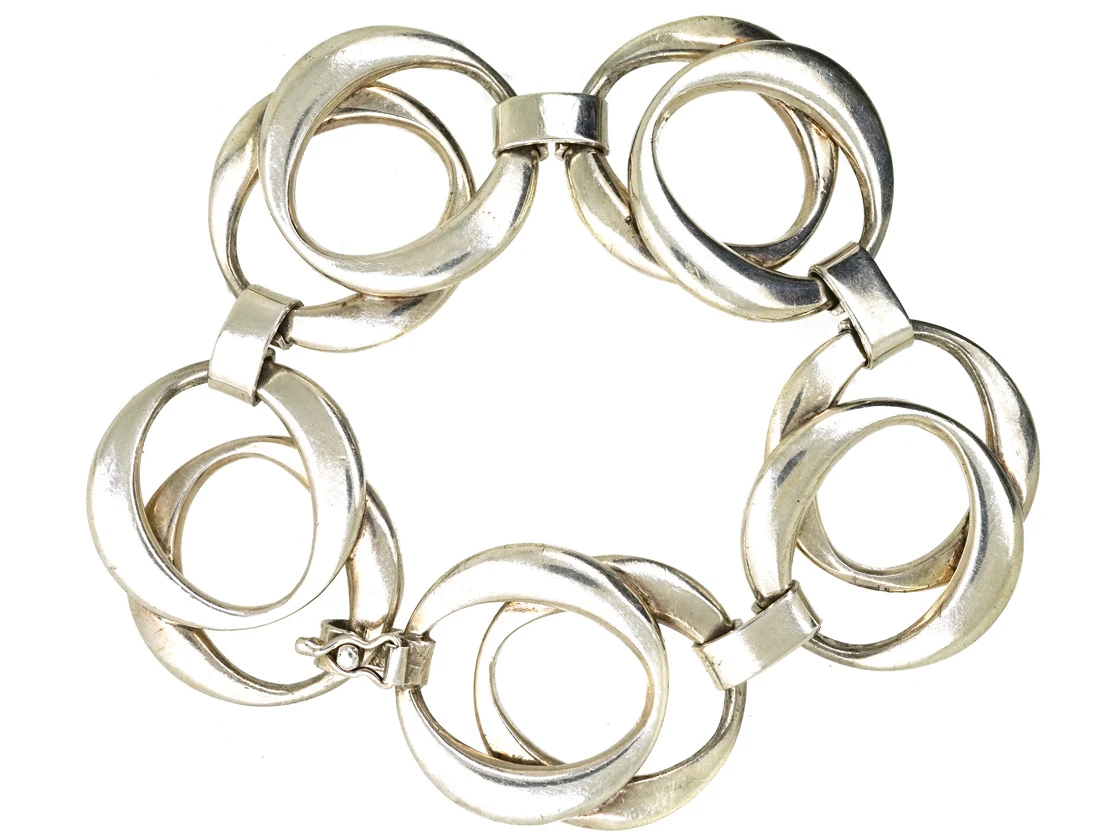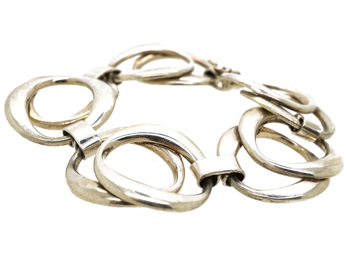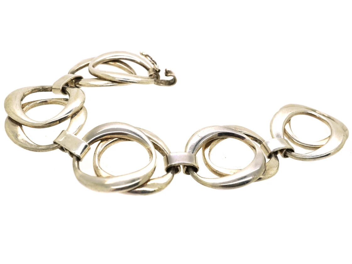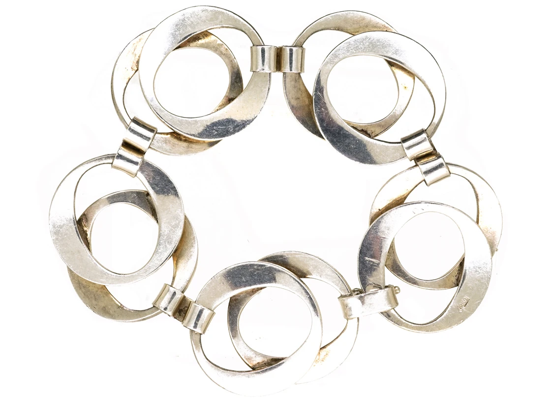 bracelet that was made in Germany in the 1970s. There are five sections of overlapping slightly ovoid circles. It looks great when worn.