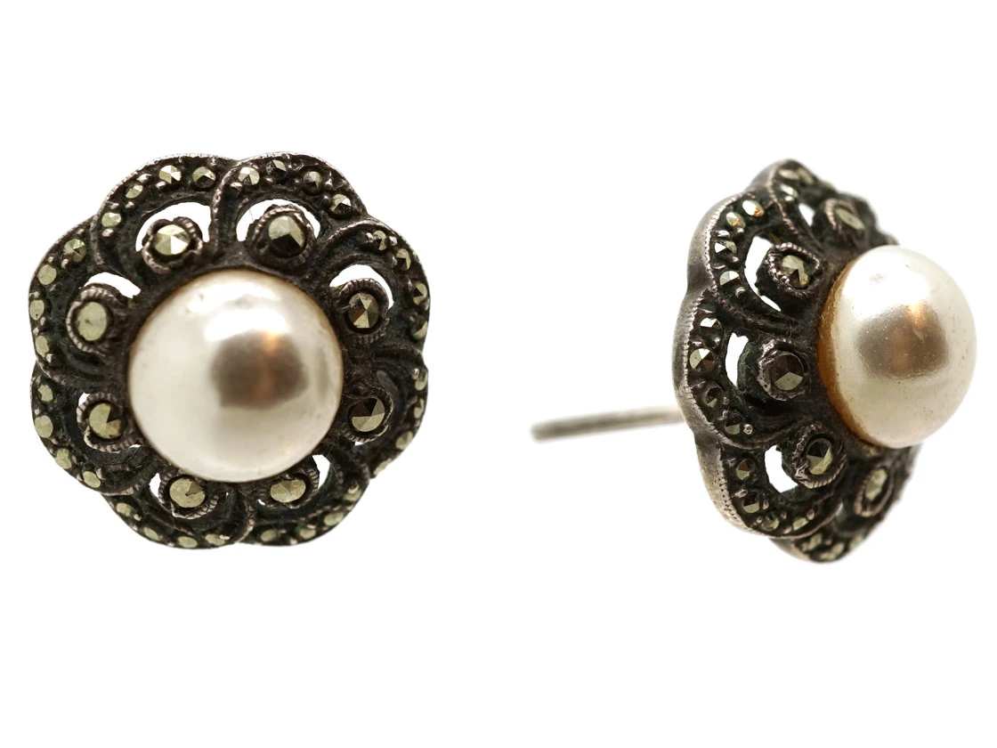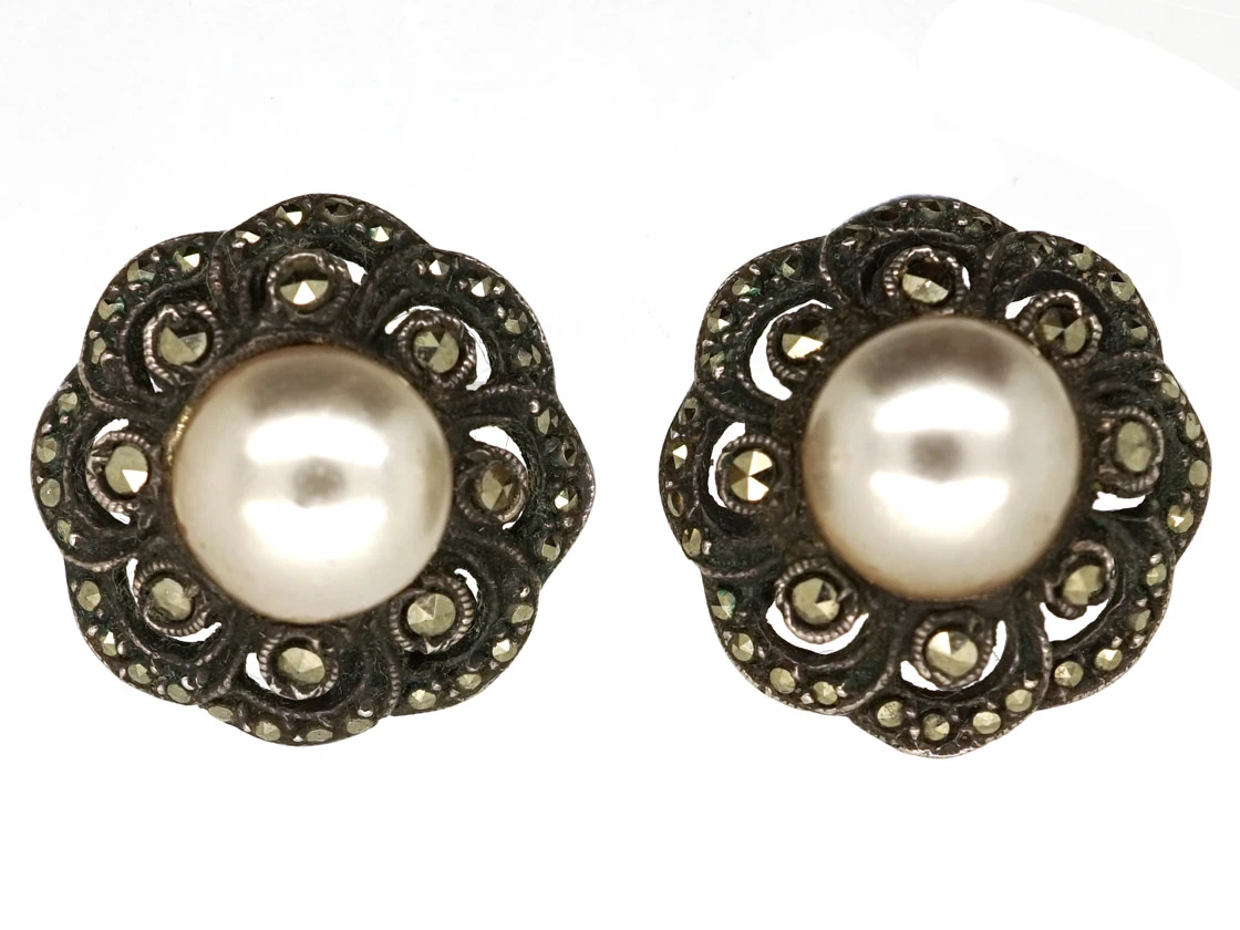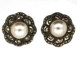 and graded marcasiteThe marcasite of jewellery is in fact iron pyrite as marcasite itself is too brittle alone for the durability required of a piece. This jewellery marcasite is sometimes called ‘fool’s gold’ given its heavily metallic appearance. Marcasite of this kind also offers a kind of iridescence, explaining its use as a more affordable diamond replacement that wi… (iron pyrites) round earrings. They were made circa 1910-1920. In the centres are pasteGlass made to resemble gem materials, which may be moulded, faceted, carved, etc. bouton pearls.