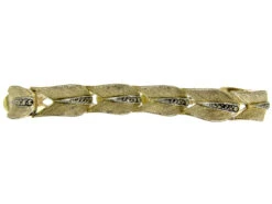 gilt bracelet designed and made by the firm of Theodor Fahrner. It is silver gilt and set with graded marcasites which are iron pyrites. It was made between 1920 and 1930. Fahrner was trained as a steel engraver, and was one of the pioneers of designer jewellery. He had freelance artists (designers) with ideas prepared by him working for him. He managed to turn the largely insignificant ring factory of his father in to one of the most creative jewellery companies in Europe.