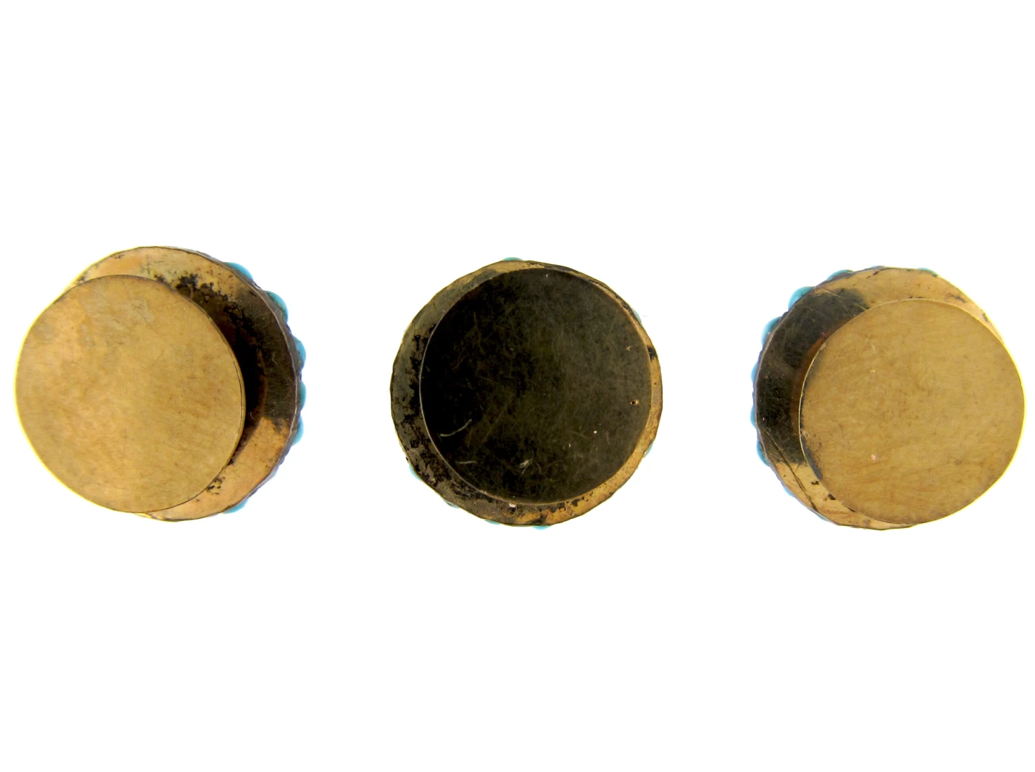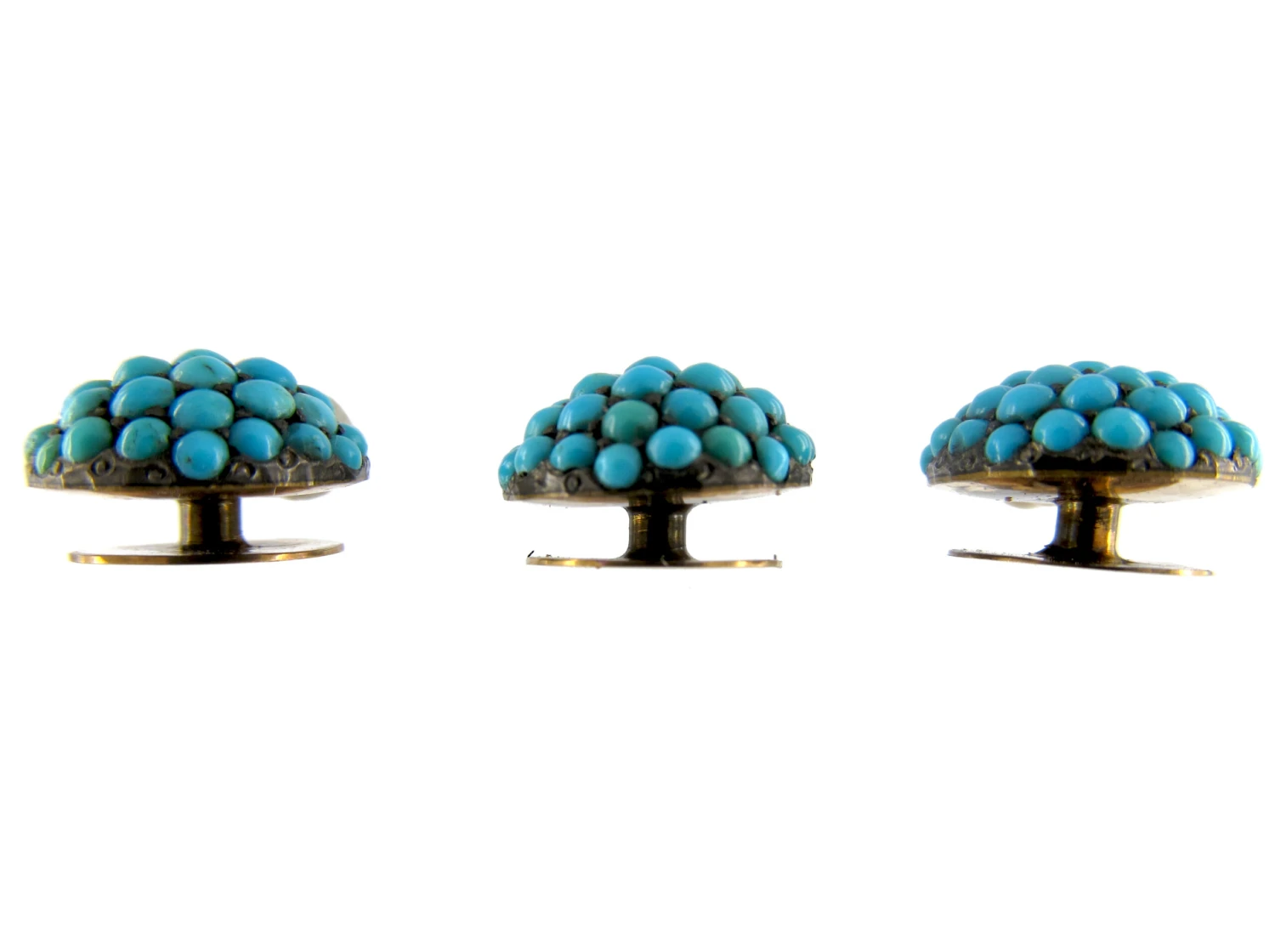 These studs were made circa 1860 and are set with small turquoiseTurquoise is an opaque gem and is often formed in what is called matrix, a black or brown veining derived from the host rock in which the gem forms. In fine jewellery, unblemished sky blue turquoise is the ideal, although regularly patterned matrix turquoise is also sought-after. stones in a shallow dome. They are 15ct62.5% pure gold (or 625 parts pure gold and 375 parts other metals). Popular during the Victorian, Edwardian and Art Deco eras but was discontinued in the mid-1930s. gold and in their original little case.