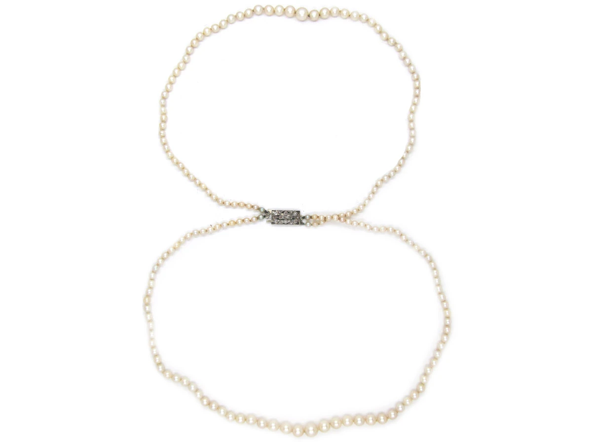 A graduated cultured pearlA man-made pearl. The pearls are produced by inserting an irritant into a mollusk. double strand necklace with a diamondA precious, lustrous gemstone made of highly compressed carbon. Diamonds are one of the hardest materials known to mankind. Colours of diamonds range from colourless, yellow, orange and brown to almost black. Natural coloured (or ‘fancy’) diamonds can be extremely rare. The cut, colour, clarity and carat weight of a diamond are the criteria jewellers use… studded white goldWhite gold is an alloy of gold and at least one other white metal – most often nickel or palladium (both of which act as a bleaching agent to reduce the natural yellow colour of the gold). clasp, made circa 1920 – for the girl who must have pearls…