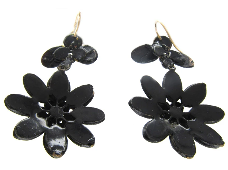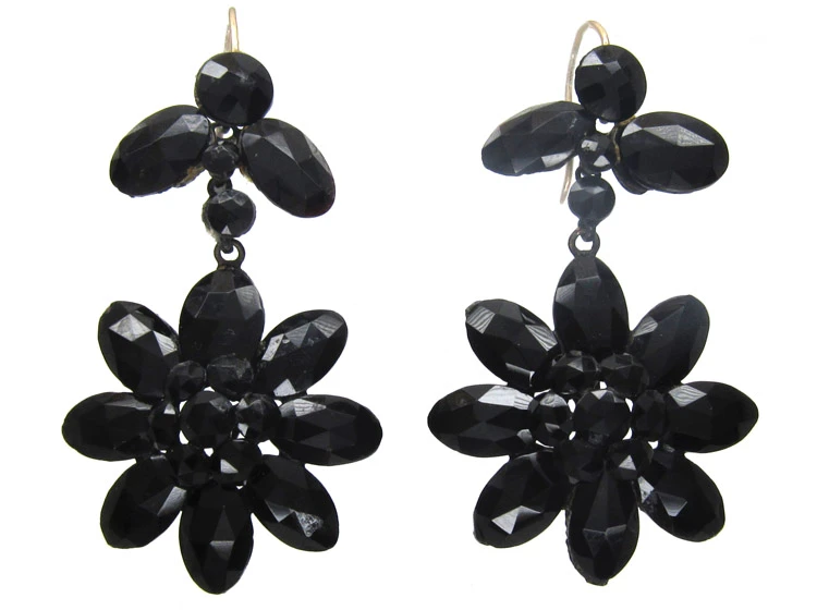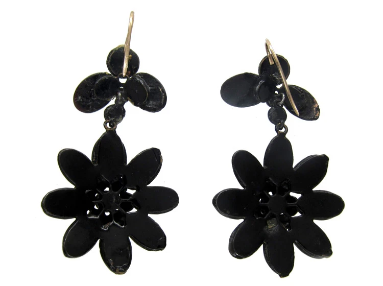 A good striking pair of VictorianJewellery made in the the Victorian era (1839-1901). Vauxhall glassThrough the eighteenth century and on into the middle of the nineteenth, Vauxhall glass was a popular gem substitute. Intense hues of highly reflective purple, orange, red, green and blue were set into butterfly, snowflake and flower motifs on necklaces, bracelets, earrings, brooches and hair combs. Made in the Vauxhall Glassworks in London, this jewellery w… earrings. These are original as some examples are made up from values. They were made circa 1840.