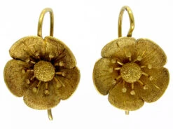A beautiful pair of VictorianJewellery made in the the Victorian era (1839-1901). daisy earrings, made circa 1870. They are very well modelled, and the gold has been chased with further detail. They are in excellent condition.