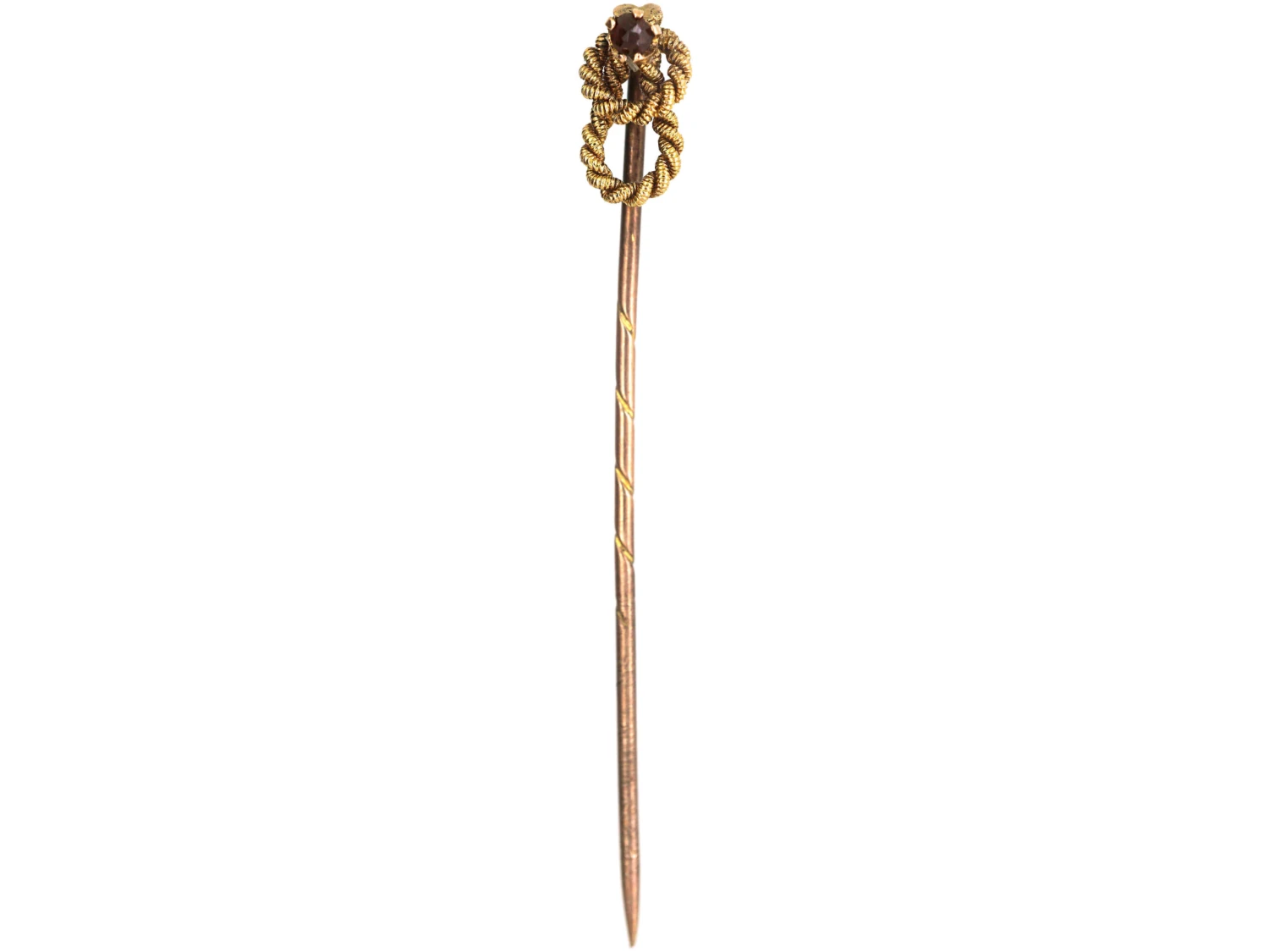 This 15ct62.5% pure gold (or 625 parts pure gold and 375 parts other metals). Popular during the Victorian, Edwardian and Art Deco eras but was discontinued in the mid-1930s. gold tie pin has a lovely meaning. It is composed of a double knot uniting two people and set with a rose cutThe ‘rose cut’, defined by its rounded outline and multiple triangular facets, is one of the earliest diamond cuts, with its origins in sixteenth century Europe. A rose cut typically has a flat base and anywhere from six to twenty four facets, the latter known as a full rose cut. garnetDescribes a group of several closely related minerals. Garnets come in a variety of colours, however the most common colour is dark red. In descriptions, ‘garnet’ tends to refer to dark red stones unless otherwise specified. representing love. It was made circa 1890. All our tie pins come with a stopper at the end of the pin.