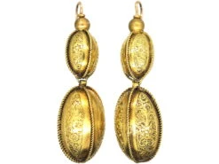 A striking pair of 15ct62.5% pure gold (or 625 parts pure gold and 375 parts other metals). Popular during the Victorian, Edwardian and Art Deco eras but was discontinued in the mid-1930s. gold drop earrings that were made circa 1860-1880. They are composed of two double drop oval hollow beads. Each one has four gold ropes running down with engraved floral detail in between. The gold is a lovely rich butter yellow colour. They look very impressive when worn
