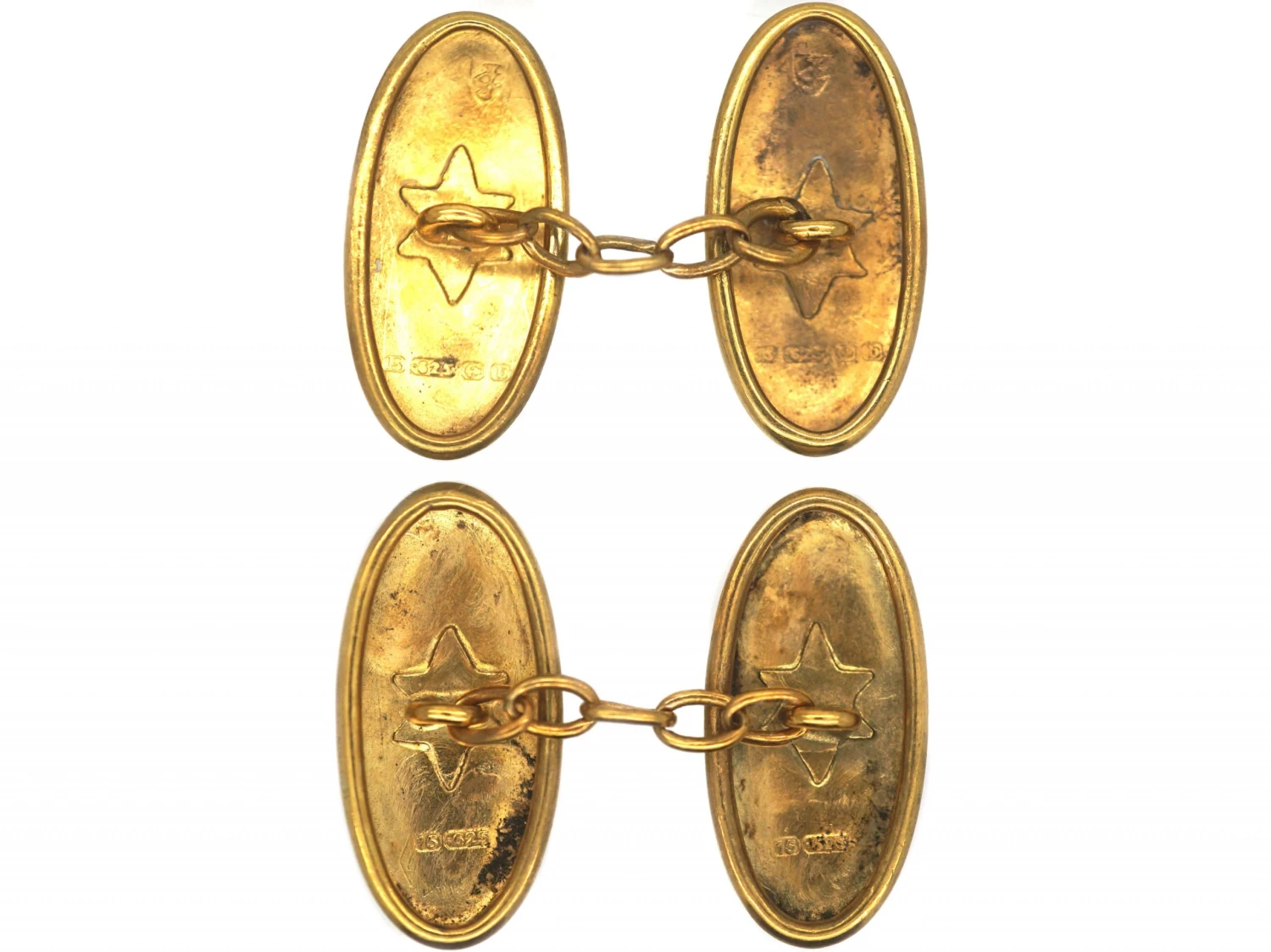 A good pair of 15ct62.5% pure gold (or 625 parts pure gold and 375 parts other metals). Popular during the Victorian, Edwardian and Art Deco eras but was discontinued in the mid-1930s. gold oval cufflinks that are fully hallmarked and were made in Birmingham in 1901. Each cufflink has been engraved with different leaf motifs. They are a lovely buttery yellow colour and look so smart on a cuff