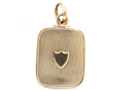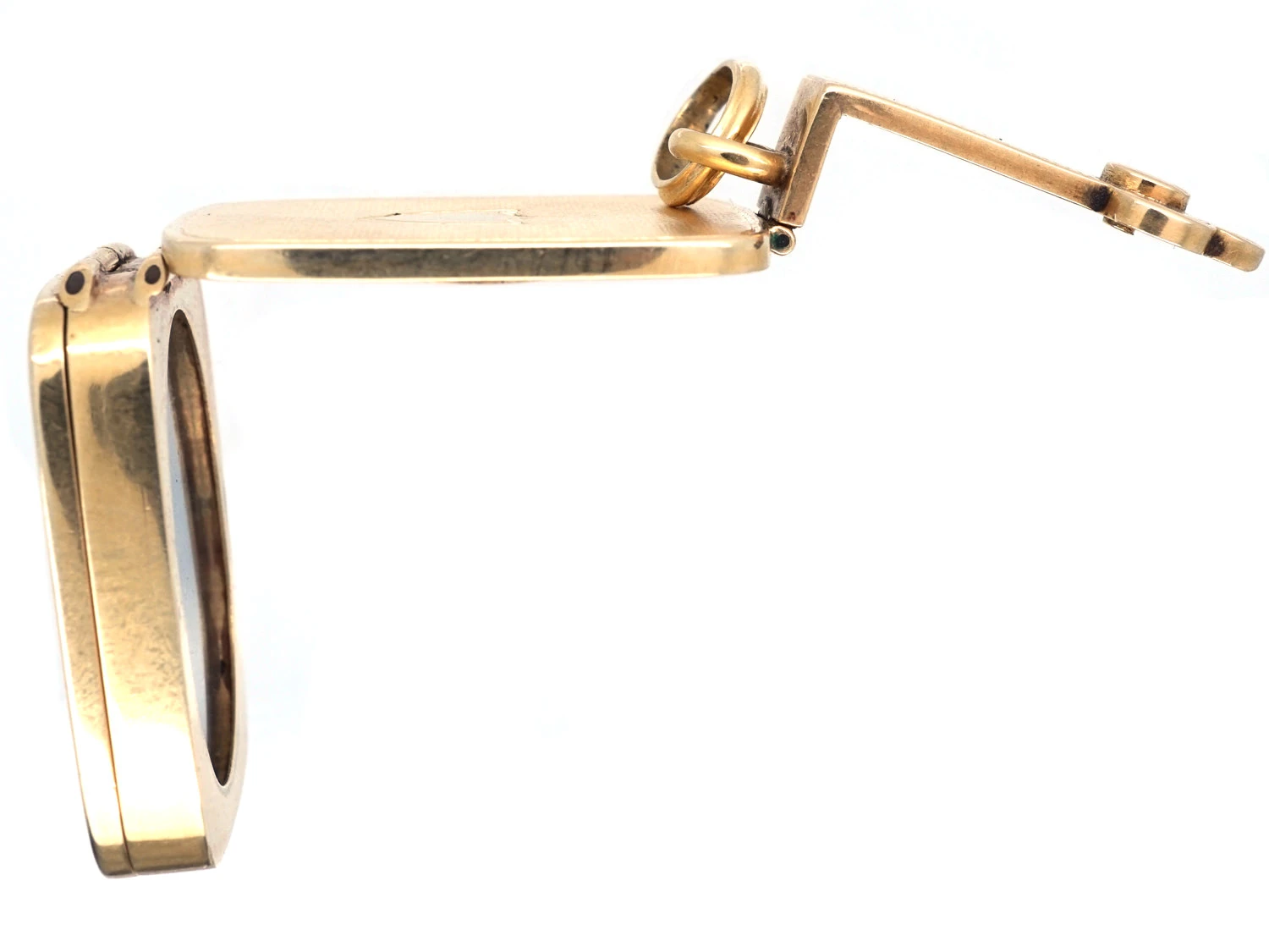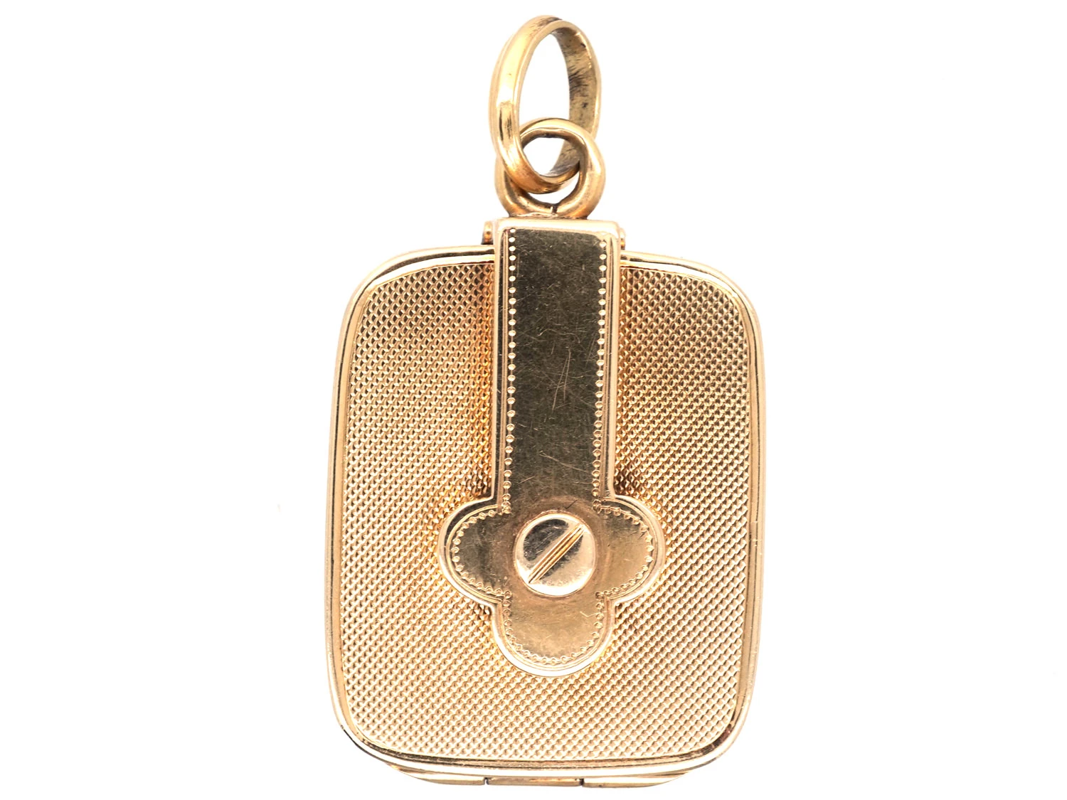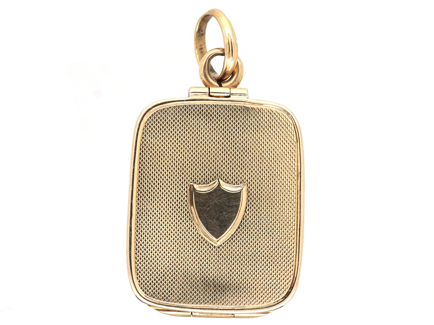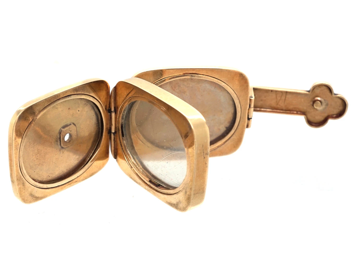 An unusual VictorianJewellery made in the the Victorian era (1839-1901). 15ct62.5% pure gold (or 625 parts pure gold and 375 parts other metals). Popular during the Victorian, Edwardian and Art Deco eras but was discontinued in the mid-1930s. gold locket which opens by lifting up the hinged trefoilA decorative ornament composed of three parts or leaves. piece. Inside it hinges out to reveal four compartments for photographs. There is a shield shaped cartouche on the reverse that can be engraved with initials if wanted. It was made circa 1860.