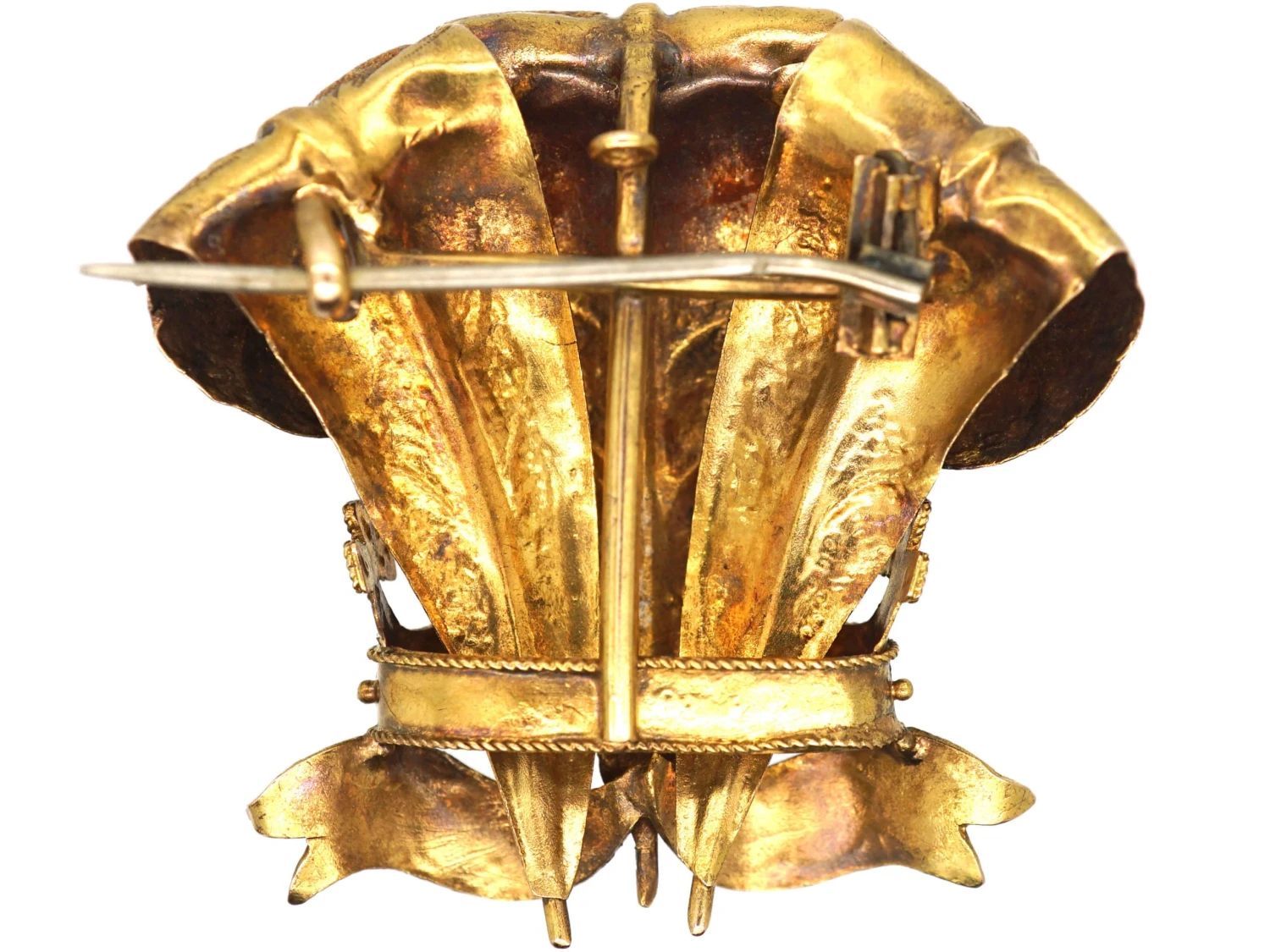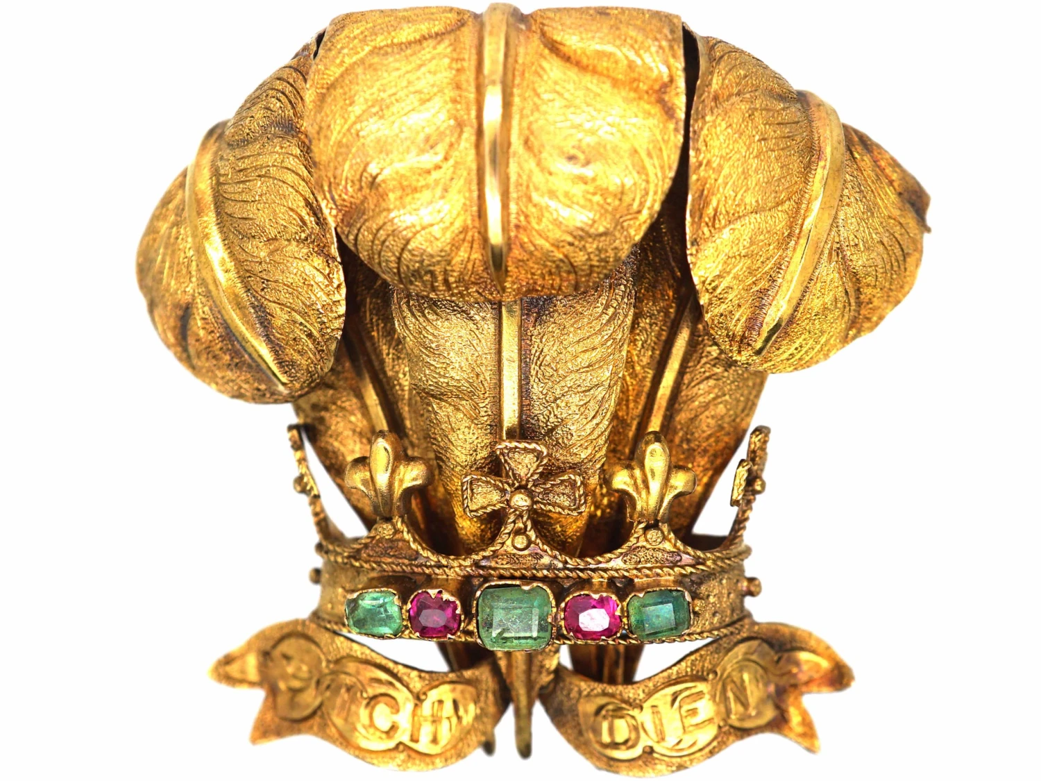 A wonderful rare VictorianJewellery made in the the Victorian era (1839-1901). brooch that features the Prince of Wales feathers. The origins trace back to Edward the Black Prince (1330-1376) who was the eldest son and heir apparent to Edward 111. He chose three ostrich feathers as an alternative to his Royal Arms following the Battle of Crecy in 1346. The Prince of Wales feathers are still used today for the William, Prince of Wales. This brooch has been beautifully made with fine engraved detail, and has been set with three foiled emeralds and two rubies.
