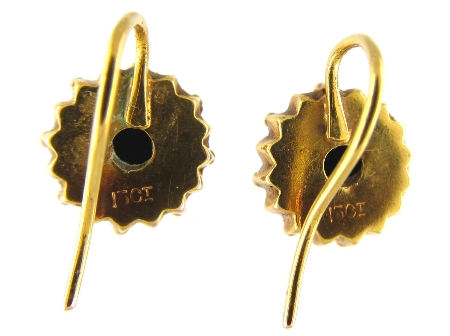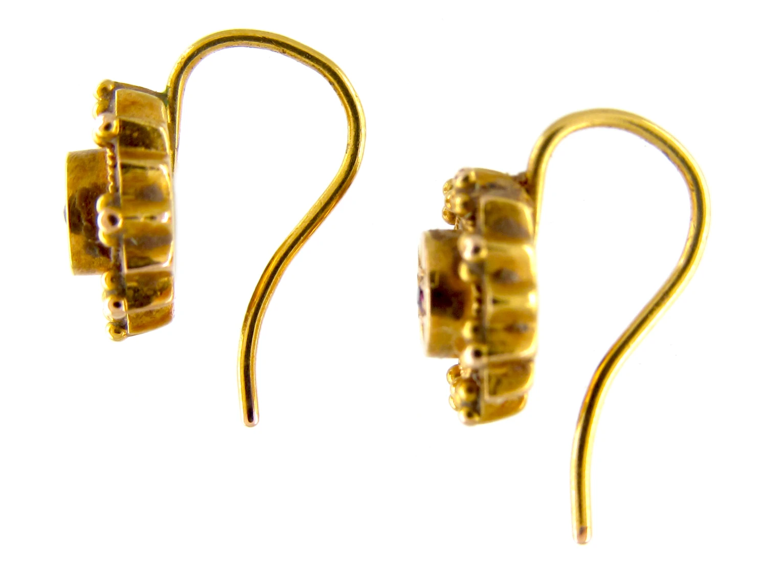 A pretty small pair of 15ct62.5% pure gold (or 625 parts pure gold and 375 parts other metals). Popular during the Victorian, Edwardian and Art Deco eras but was discontinued in the mid-1930s. gold VictorianJewellery made in the the Victorian era (1839-1901). earrings which have been set with one rubyOne of the most valuable gemstones on earth. From the corundum family, the red variety being ruby and the blue, sapphire. With the exception of the diamond, corundum is the hardest of the gemstones on the Mohs scale scoring a 9. in each one. They are good every day earrings.