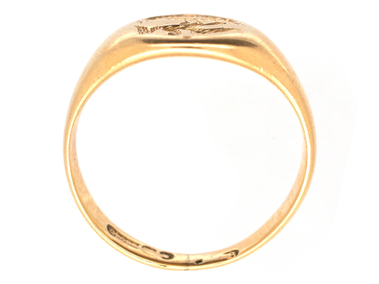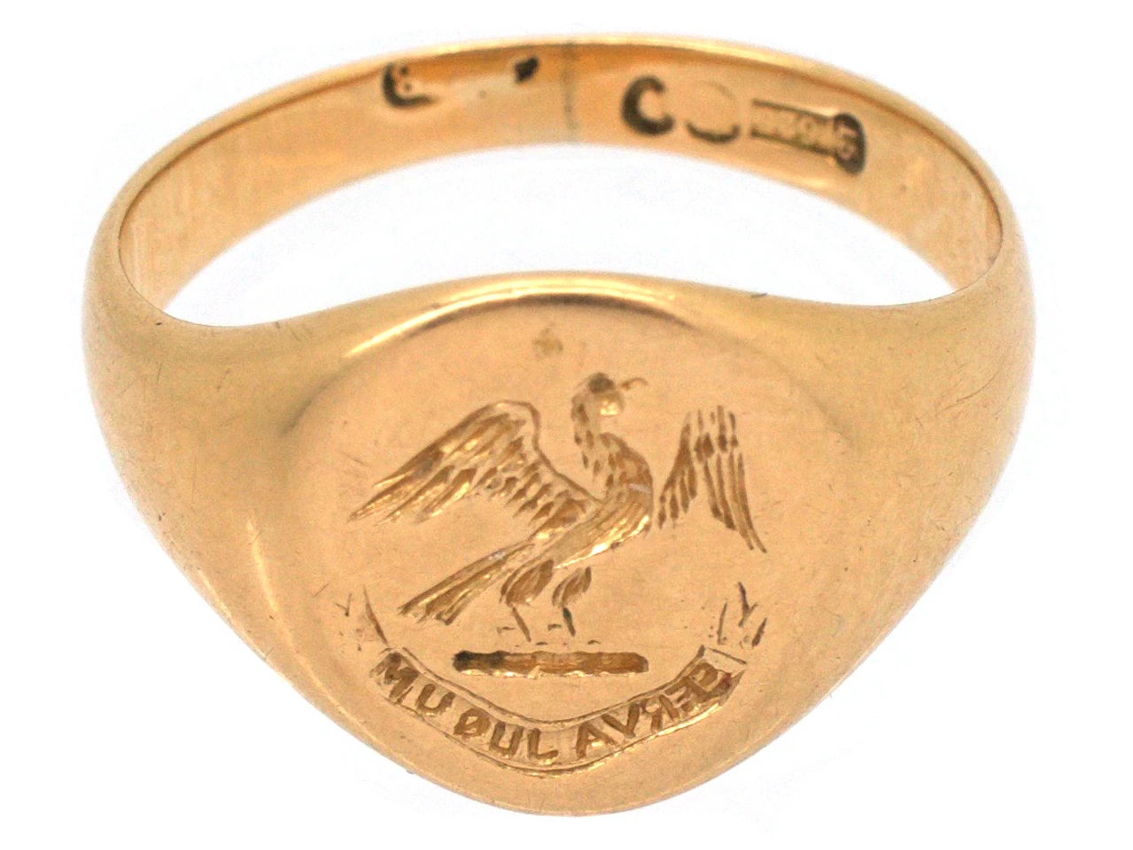 A good 15ct62.5% pure gold (or 625 parts pure gold and 375 parts other metals). Popular during the Victorian, Edwardian and Art Deco eras but was discontinued in the mid-1930s. gold signet ringA ring with a central plaque on which one’s initials, a seal, or a crest is engraved. that was made circa 1880. It has a detailed carved intaglioAn engraved stone, the opposite of a cameo, with a recessed design cut below the surface of the stone. Intaglio designs are common for signet rings and fob seals. crest of an eagle. The motto reads “Serva juqum” in latin meaning “Keep the yolk” – the motto of the Hay clan.