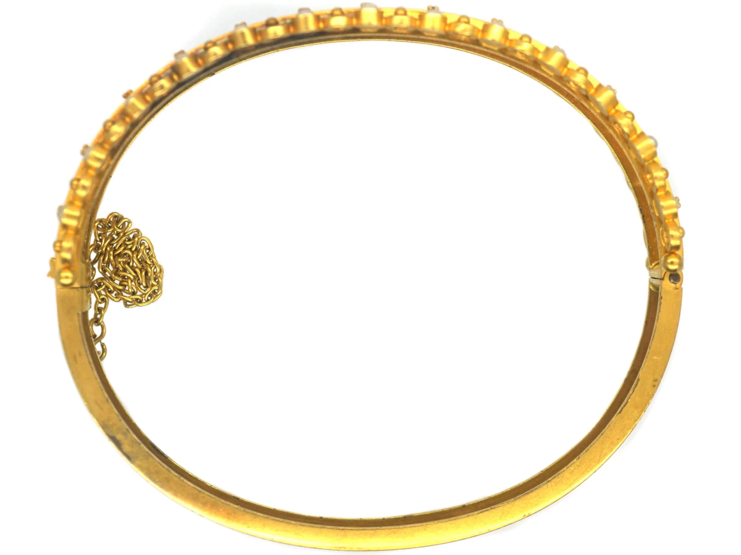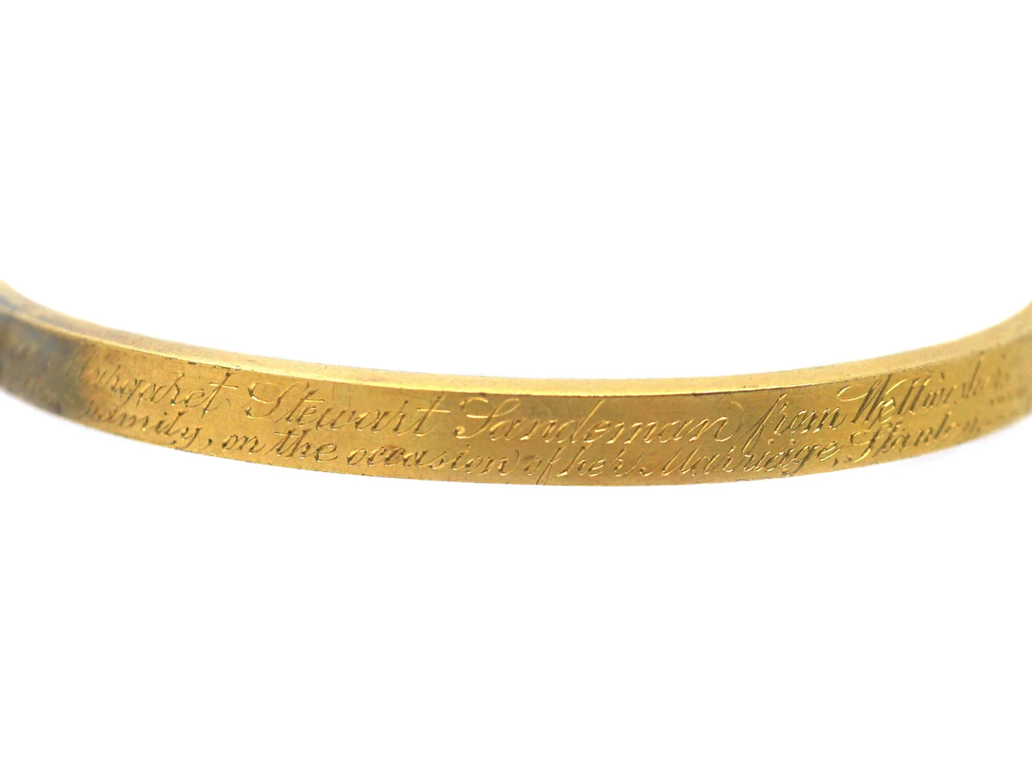 A beautiful 18ct75% pure gold (or 750 parts pure gold and 250 parts other metals) gold bangle with a history! Engraved around the back is “Presented to Miss Margaret Stewart Sandeman from Wellwishers Tenants and Employees of the Family on the occasion of her marriage, Stanley, 22nd Oct, 1890” It is always a lovely surprise to find original pieces of jewellery with literally all their history recorded on the item as with this bangle. What an amazing gift from the tenants on the Scottish estate in 1890. It has a line of old mine cutAn 18th, 19th and early 20th century diamond shape, typically cushion or asymmetrical, marked by a small table, a high crown and a large culet. Culets are the small flat facets at the bottom of a stone which appear to the untrained eye as a hole in the middle of the stone. Before the advent of modern machinery which allows for the precise faceting we see tod… diamonds set in diamondA precious, lustrous gemstone made of highly compressed carbon. Diamonds are one of the hardest materials known to mankind. Colours of diamonds range from colourless, yellow, orange and brown to almost black. Natural coloured (or ‘fancy’) diamonds can be extremely rare. The cut, colour, clarity and carat weight of a diamond are the criteria jewellers use… shaped settings across the top with naturalA natural stone is called such because it has not been subjected to any treatments. split pearls within gold settings on either side. In between are open circular gold ribbed wires with further gold details along the central bandA type of ring which is an equal width all the way round. They are traditionally used for wedding rings.