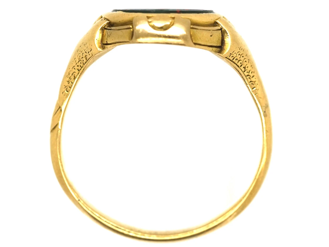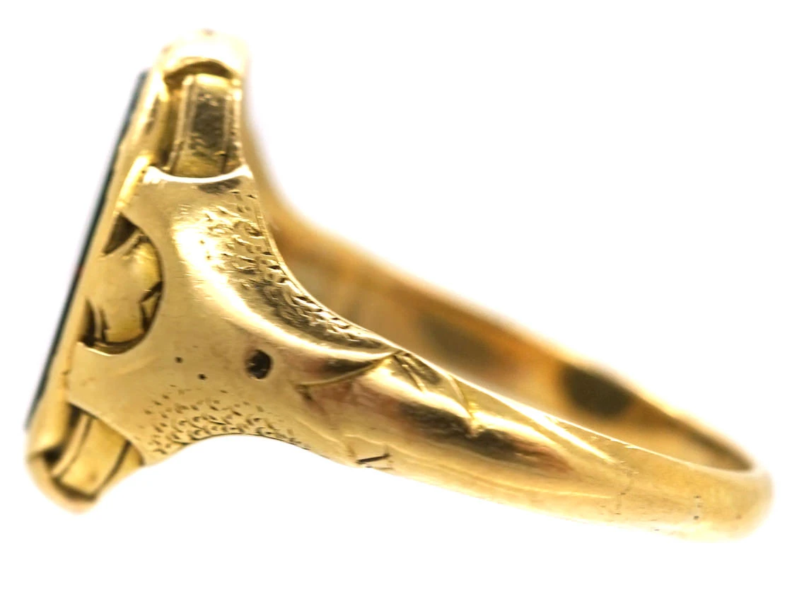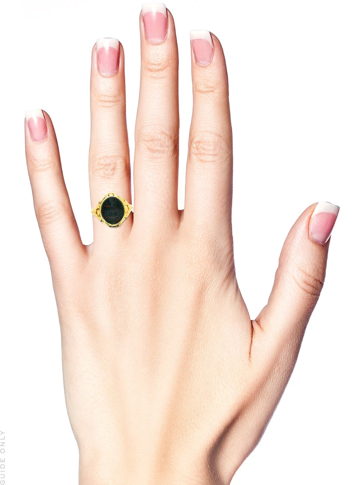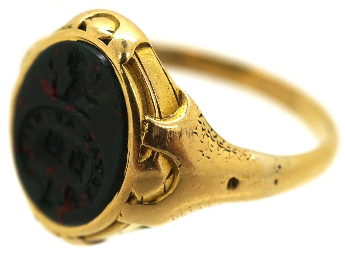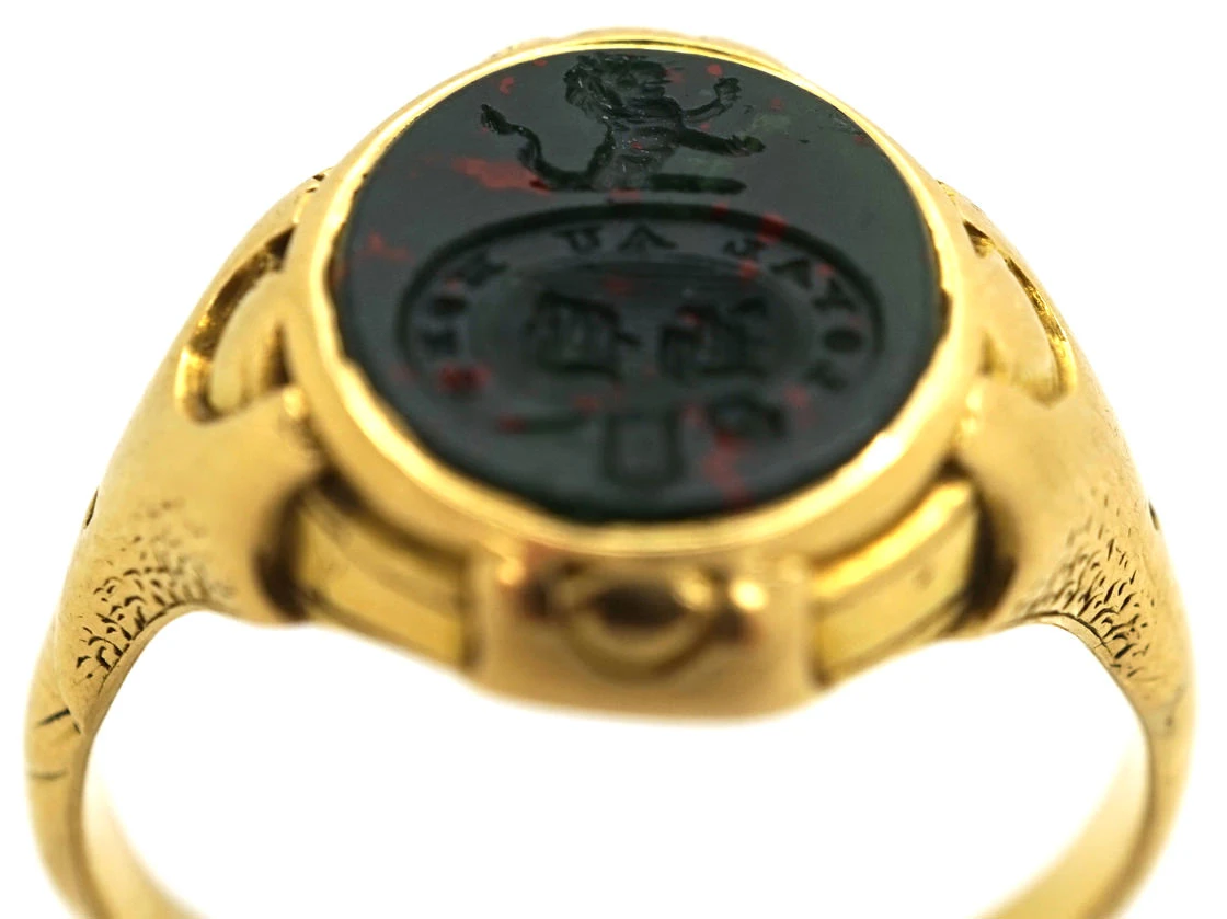 A good 18ct75% pure gold (or 750 parts pure gold and 250 parts other metals) gold VictorianJewellery made in the the Victorian era (1839-1901). signet ringA ring with a central plaque on which one’s initials, a seal, or a crest is engraved. set with an oval bloodstoneA dark green to dark bluish-green variety of Chalcedony that is splattered with red or brown spots that resemble blood. The extent of the marking varies depending on the stone. Spots are favoured over larger stripes and markings. with a crest intaglioAn engraved stone, the opposite of a cameo, with a recessed design cut below the surface of the stone. Intaglio designs are common for signet rings and fob seals.. It is of a rampant lion over a garter with the words “Loyal au Mort” that translates “Loyal to Death” and a monogram within.