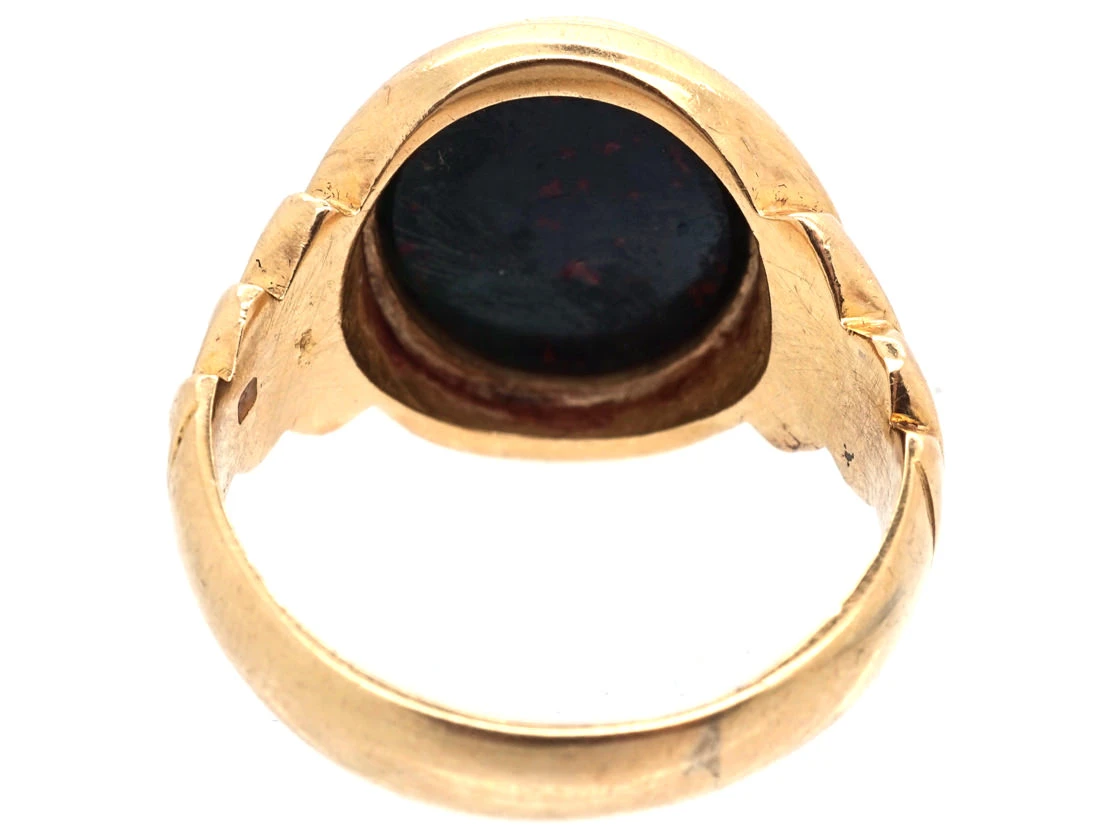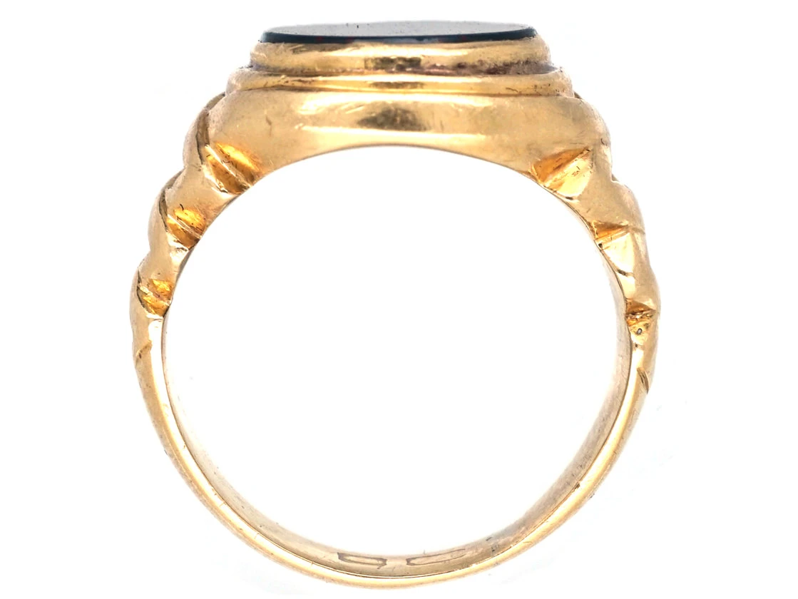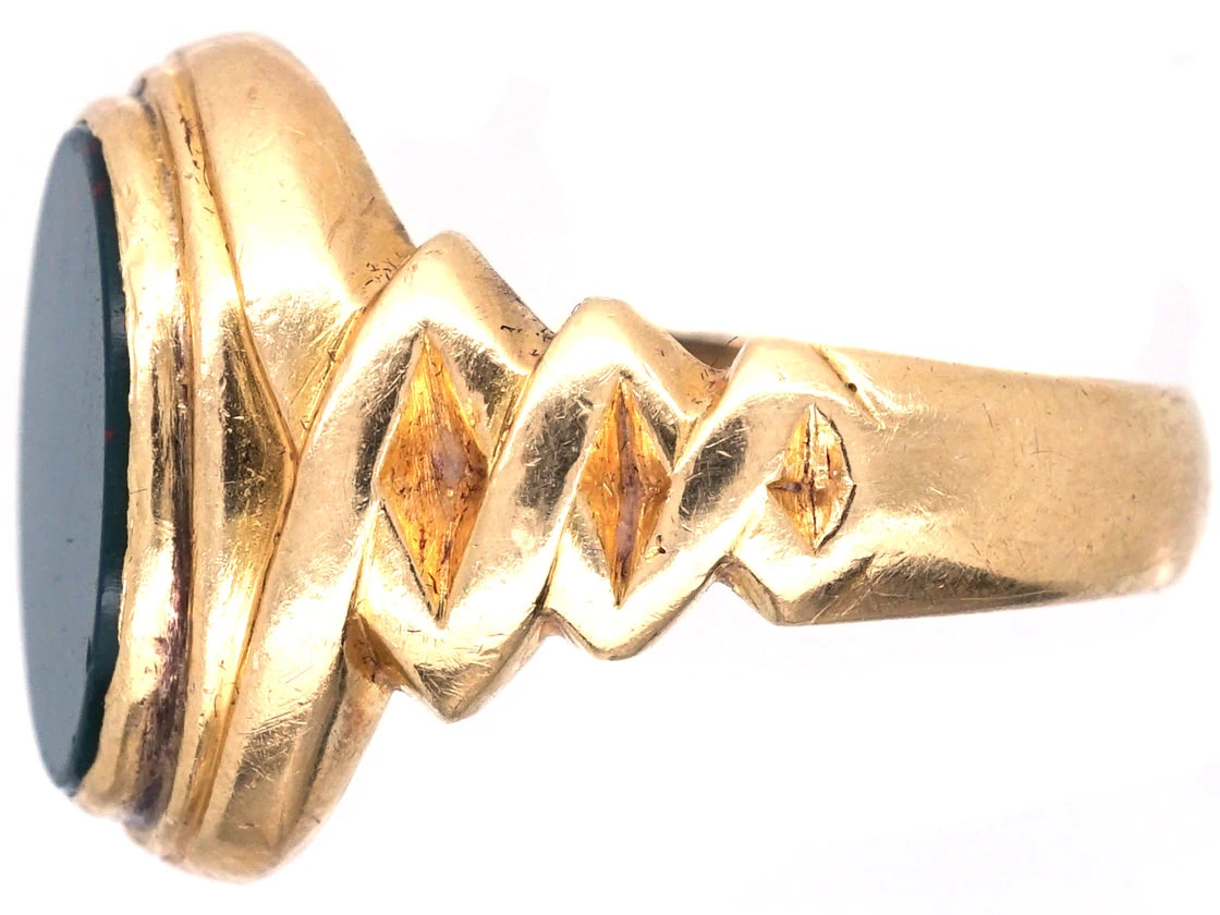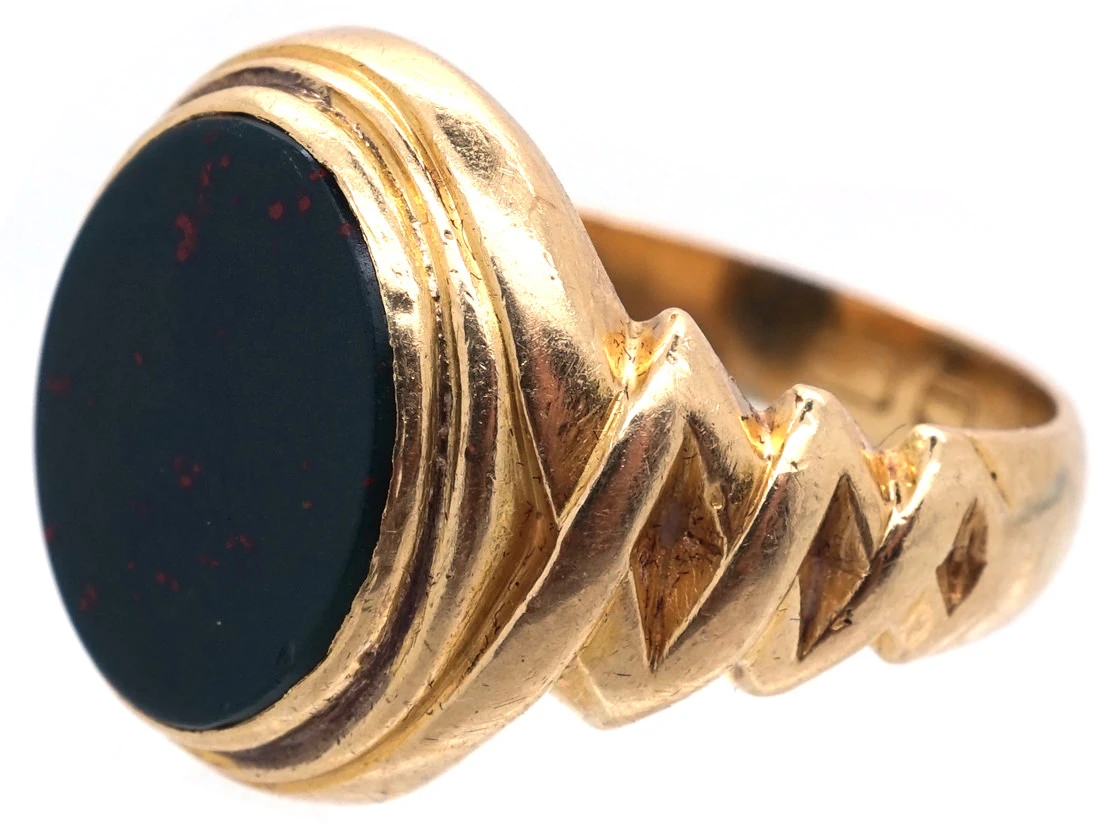 A good looking 18ct75% pure gold (or 750 parts pure gold and 250 parts other metals) gold oval signet ringA ring with a central plaque on which one’s initials, a seal, or a crest is engraved.. It is set with a bloodstoneA dark green to dark bluish-green variety of Chalcedony that is splattered with red or brown spots that resemble blood. The extent of the marking varies depending on the stone. Spots are favoured over larger stripes and markings. that can be engraved if desired. It was made circa 1890.