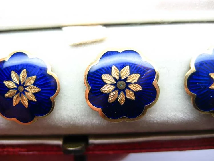 A beautiful set of six VictorianJewellery made in the the Victorian era (1839-1901). dress shirt values in Royal Blue EnamelA pigmented glass-like material used in powdered form and fused onto the metal surface of a piece of jewellery. set in 18ct75% pure gold (or 750 parts pure gold and 250 parts other metals) Gold and with a finely detailed gold central flower design. They were made circa 1860-1880 and are in the original box lined with silk with the name Parkes, Regent Street.