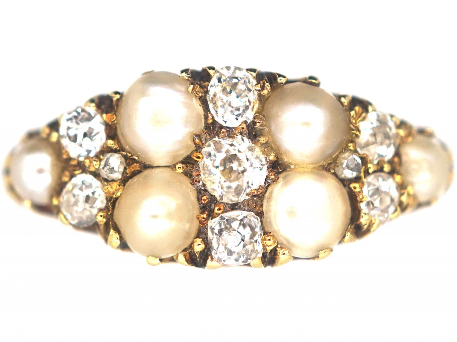 A lovely 18ct75% pure gold (or 750 parts pure gold and 250 parts other metals) gold ring that was made circa 1880. It has been set with old mine cutAn 18th, 19th and early 20th century diamond shape, typically cushion or asymmetrical, marked by a small table, a high crown and a large culet. Culets are the small flat facets at the bottom of a stone which appear to the untrained eye as a hole in the middle of the stone. Before the advent of modern machinery which allows for the precise faceting we see tod… diamonds and naturalA natural stone is called such because it has not been subjected to any treatments. split pearls with two rose diamondA precious, lustrous gemstone made of highly compressed carbon. Diamonds are one of the hardest materials known to mankind. Colours of diamonds range from colourless, yellow, orange and brown to almost black. Natural coloured (or ‘fancy’) diamonds can be extremely rare. The cut, colour, clarity and carat weight of a diamond are the criteria jewellers use… pointsA unit of weight for a diamond, being one-hundredth of a metric carat. It is used for weights that are decimal fractions of a carat, and all figures after the second decimal point are, in the diamond and jewellery trade, generally discarded. in between. The Victorians loved the combination of diamonds and pearls as they went so well with the fashions of the period. It looks impressive when worn and is as wearable now as it was in the late 1800s