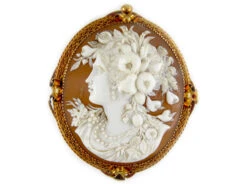 A beautifully carved shell cameoA layered stone or shell in which the design is cut in relief where the main design is carved onto the top layer and the remainder is carved away to reveal the next layer using the natural colours of the stone or shell to produce the different shadings of the carving. This is done in shell, coral, lava and various stones. of a ladies head and shouldersThe point on a ring where the central section meets the shank or band, often carved, decorated or inlaid with small diamond accent stones.. It has earrings to match which are in the āEarringsā section of the site. They were made circa 1860 and are the best examples of their type.