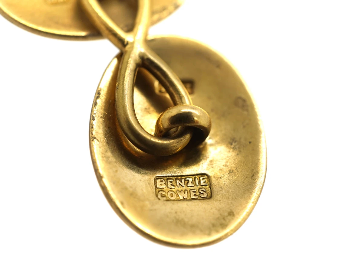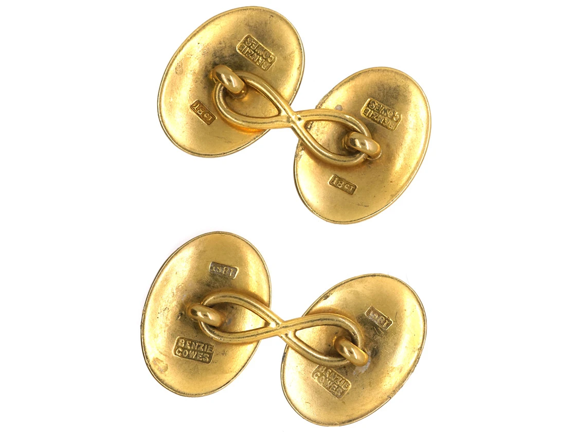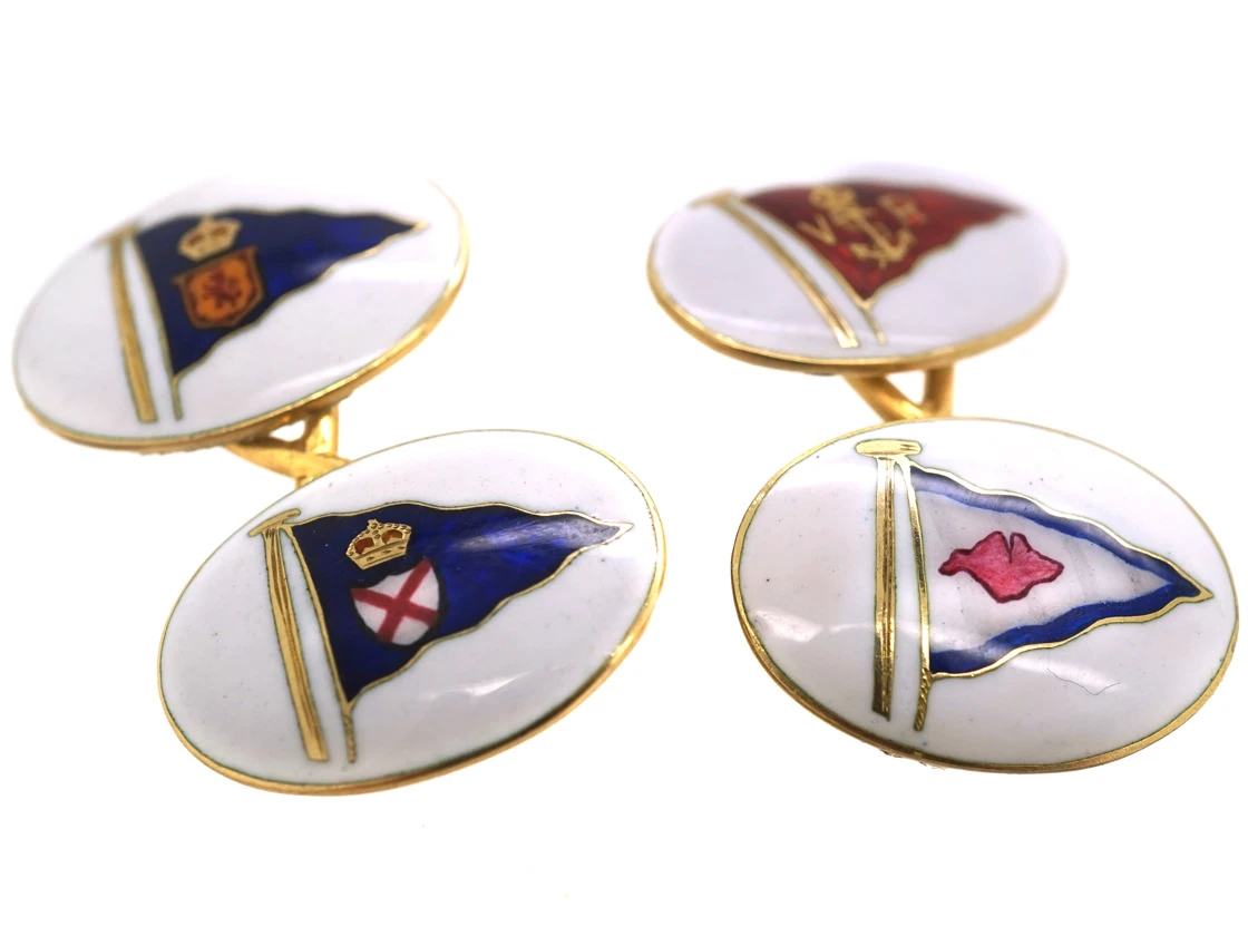 A rare pair of 18ct75% pure gold (or 750 parts pure gold and 250 parts other metals) gold and enamelA pigmented glass-like material used in powdered form and fused onto the metal surface of a piece of jewellery. cufflinks that are a good example of what was produced by the firm Benzie based in Cowes on the Isle of Wight. They were made circa 1880. Benzies was founded in 1862 by Mr Simpson Benzie. The firm made all sorts of good quality jewellery including tie pins and brooches that were nautical related. The red flag was the flag for the Royal Victoria yacht club.