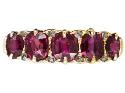 For rubyOne of the most valuable gemstones on earth. From the corundum family, the red variety being ruby and the blue, sapphire. With the exception of the diamond, corundum is the hardest of the gemstones on the Mohs scale scoring a 9. lovers this 18ct75% pure gold (or 750 parts pure gold and 250 parts other metals) gold ring has five well matched naturalA natural stone is called such because it has not been subjected to any treatments. rubies with tiny rose diamondA precious, lustrous gemstone made of highly compressed carbon. Diamonds are one of the hardest materials known to mankind. Colours of diamonds range from colourless, yellow, orange and brown to almost black. Natural coloured (or ‘fancy’) diamonds can be extremely rare. The cut, colour, clarity and carat weight of a diamond are the criteria jewellers use… pointsA unit of weight for a diamond, being one-hundredth of a metric carat. It is used for weights that are decimal fractions of a carat, and all figures after the second decimal point are, in the diamond and jewellery trade, generally discarded. in between. It was made in 1898 in Birmingham and has a carved half hoop shankThe circle of metal that attaches to the decorative part of a ring and encircles the finger.. It would make a lovely engagement ring.