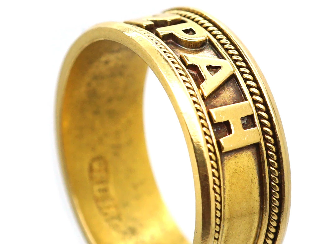 An unusual 18ct gold ring that was made circa 1880-1900. It has raised letters that spell Mizpah. Mizpah is a Hebrew word that means ‘watchtower’ and is loosely interpreted as “May God watch over you”. On either side is a rope work motif.