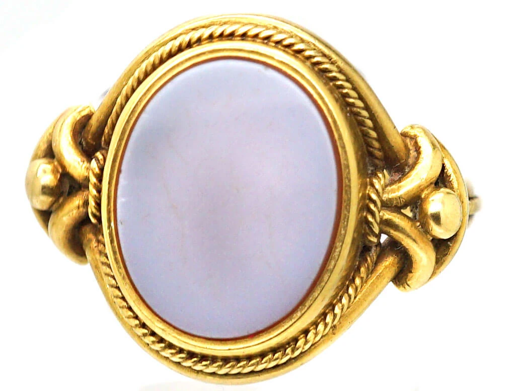 A good 18ct75% pure gold (or 750 parts pure gold and 250 parts other metals) gold signet ringA ring with a central plaque on which one’s initials, a seal, or a crest is engraved. that was made circa 1880. It has been set with a carnelianA translucent red variety of chalcedony which in its turn is a form of cryptocrystalline quartz. Carnelian has been known and used since antiquity when it was sourced from the surfaces of the Egyptian and Arabian deserts. The most prized carnelian has a true blood-red color. that has been polished to the white bandA type of ring which is an equal width all the way round. They are traditionally used for wedding rings.