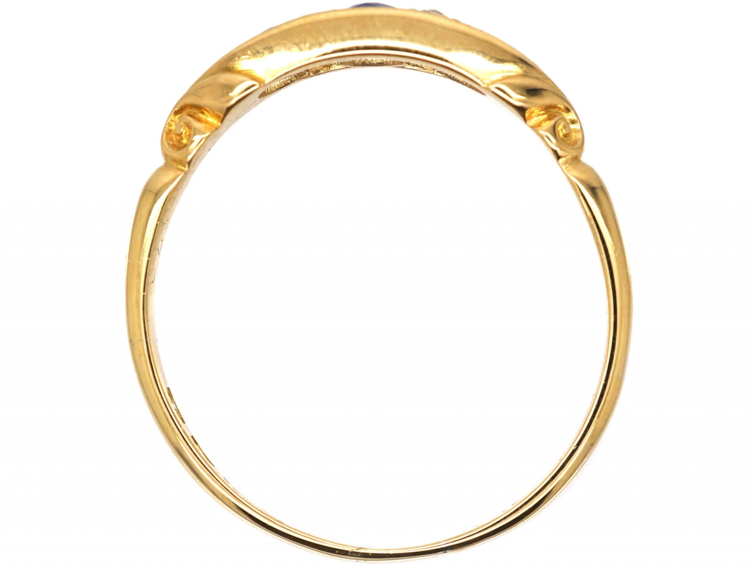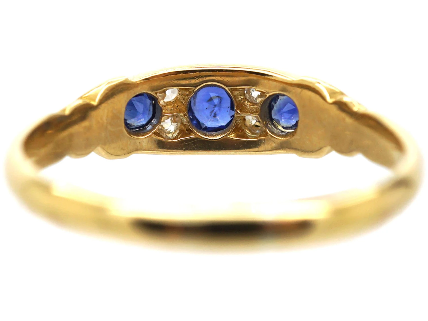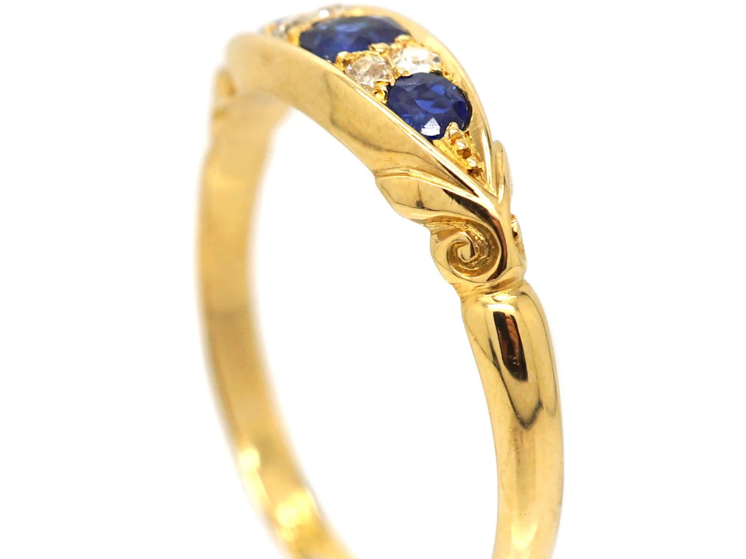 A good looking 18ct gold ring that was made in London in 1894.  It has been set with three oval sapphires with small diamonds in between. The shoulders have incised scroll decoration and are very much part of the overall design. It would be ideal as an engagement ring.