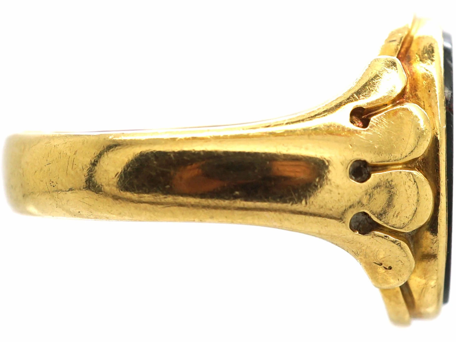 A good looking heavy gage 18ct75% pure gold (or 750 parts pure gold and 250 parts other metals) gold signet ringA ring with a central plaque on which one’s initials, a seal, or a crest is engraved. that was made in Birmingham in 1893 by Charles Green & Sons who are a well known firm that made good quality jewellery.  It has been set with a plain bloodstoneA dark green to dark bluish-green variety of Chalcedony that is splattered with red or brown spots that resemble blood. The extent of the marking varies depending on the stone. Spots are favoured over larger stripes and markings. that can be engraved if wanted. The shouldersThe point on a ring where the central section meets the shank or band, often carved, decorated or inlaid with small diamond accent stones. are an unusual design resembling animals pads. It is an impressive large look and can be worn on a daily basis.