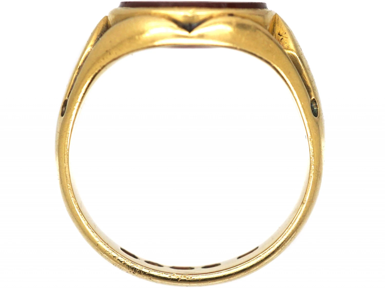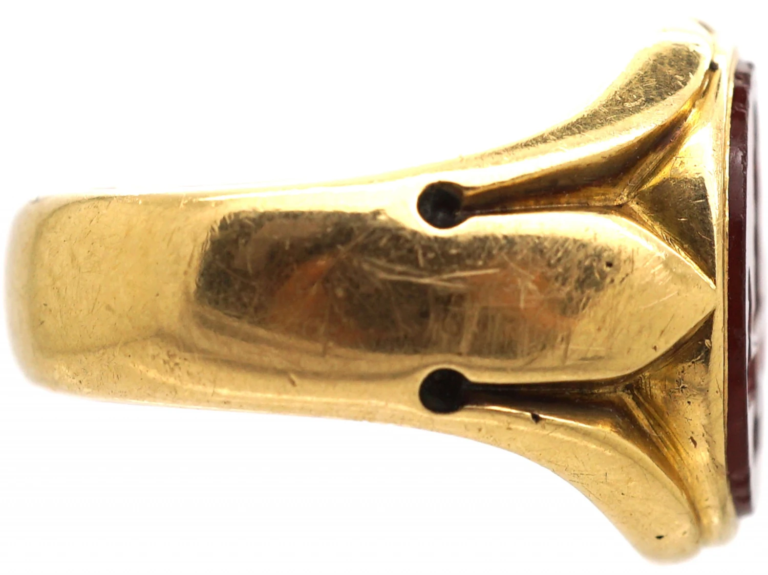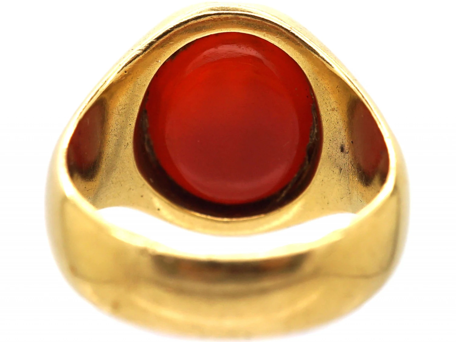 This heavy gage 18ct75% pure gold (or 750 parts pure gold and 250 parts other metals) gold signet ringA ring with a central plaque on which oneās initials, a seal, or a crest is engraved. is a strong architectural design with ornate incised shouldersThe point on a ring where the central section meets the shank or band, often carved, decorated or inlaid with small diamond accent stones.. It was made in London in 1888. In the centre is a carnelianāAĀ translucent red variety of chalcedony which in its turn is a form of cryptocrystalline quartz.Ā āCarnelian hasāĀ been known and used since antiquity when it was sourced from the surfaces of the Egyptian and Arabian deserts. TheĀ āmostĀ prized carnelian has a true blood-red color. that has been engraved with a tree trunk and the ribbon motto below reads āFortem posce Animumā which literally means āSeek the strength of the mindā or āThe courage to challenge lifeā. A meaningful and dramatic signet ring.